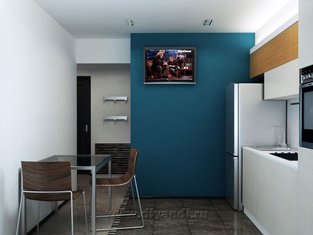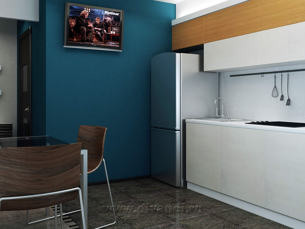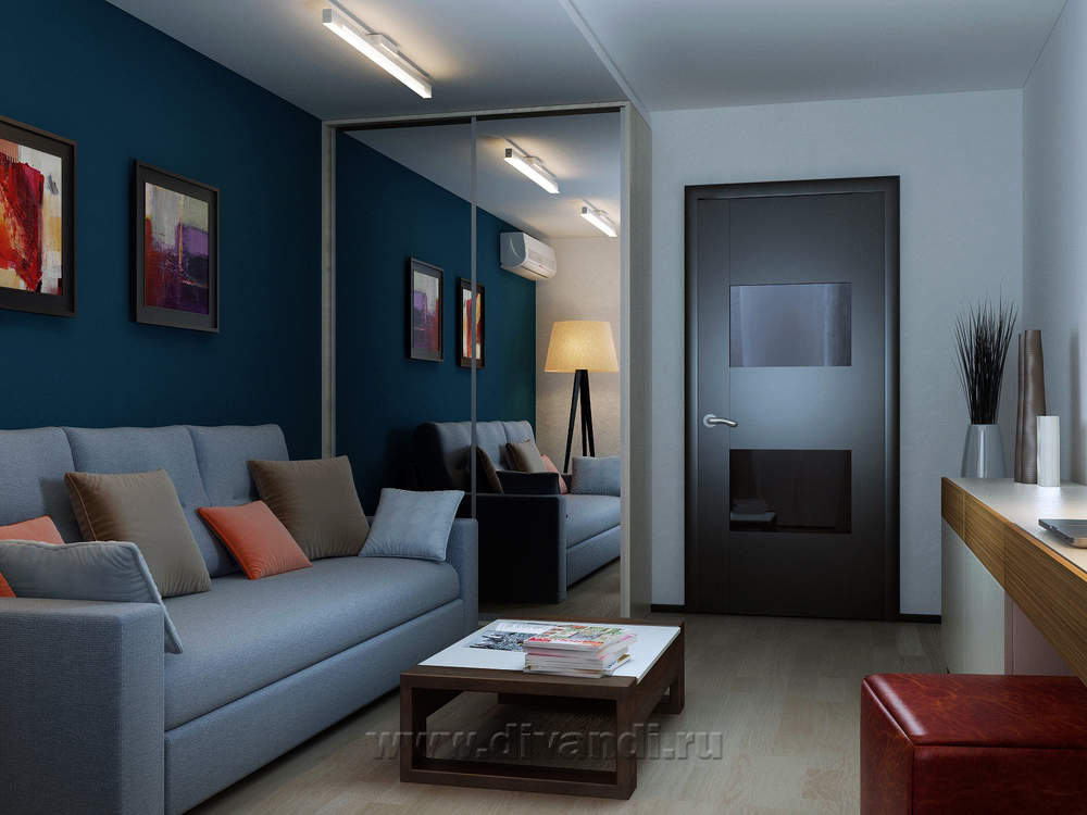 Однокомнатная квартира с лаконичным дизайном и тонко подобранными цветами и акцентами. Самое важное в ней-элегантный цвет морской волны, перекликающийся с теплыми рыжими оттенками.