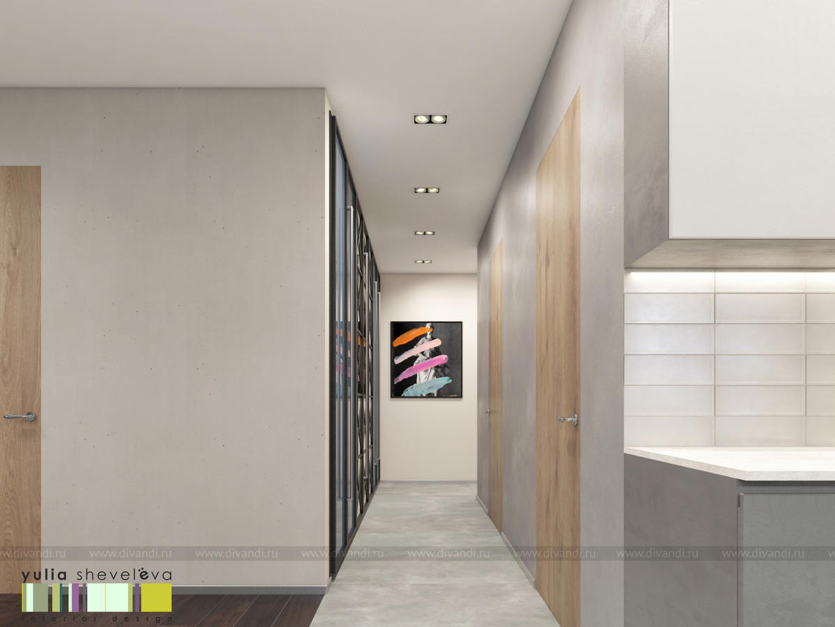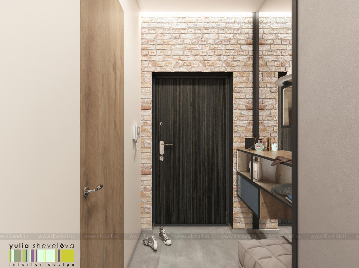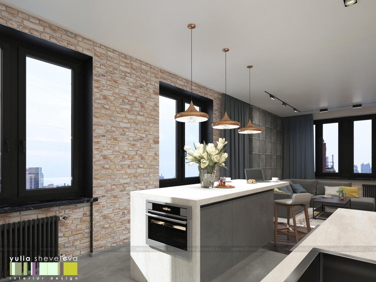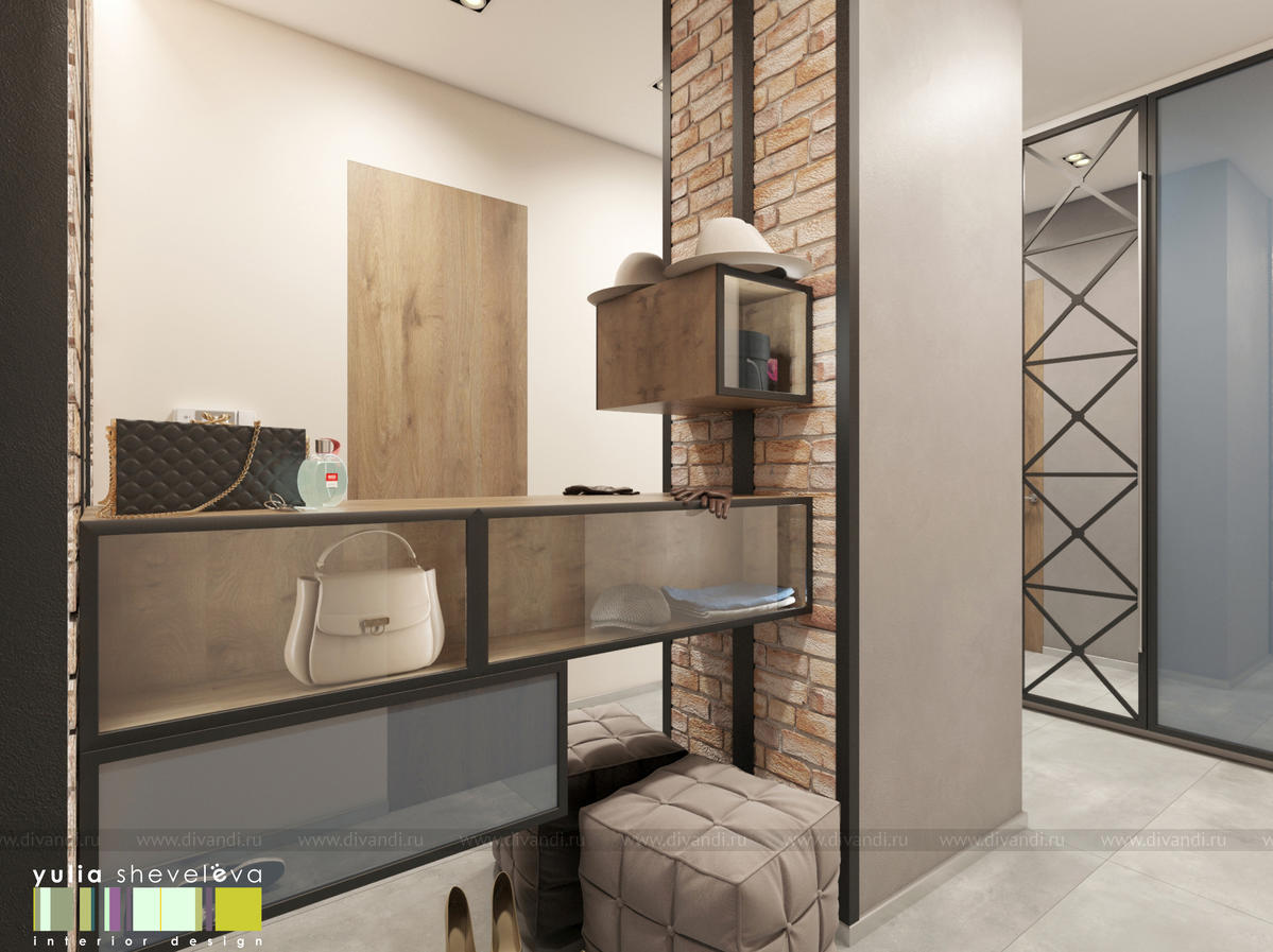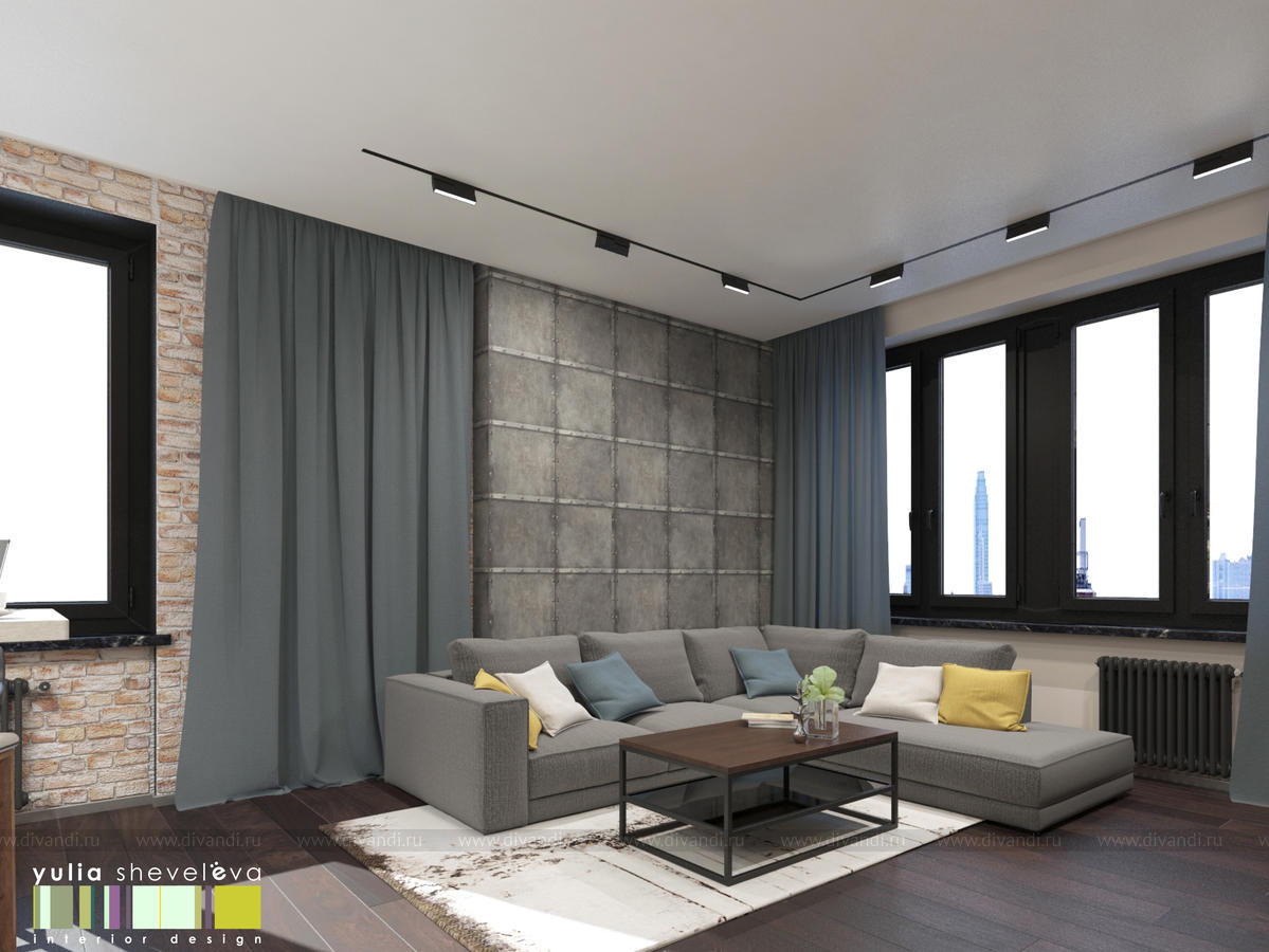 Сам интерьер квартиры решен в современном направлении с элементами стиля лофт. Гамма для всей квартиры была выбрана общая - это сочетание серого и графита, дерева и кирпича, стекла и черного металла.