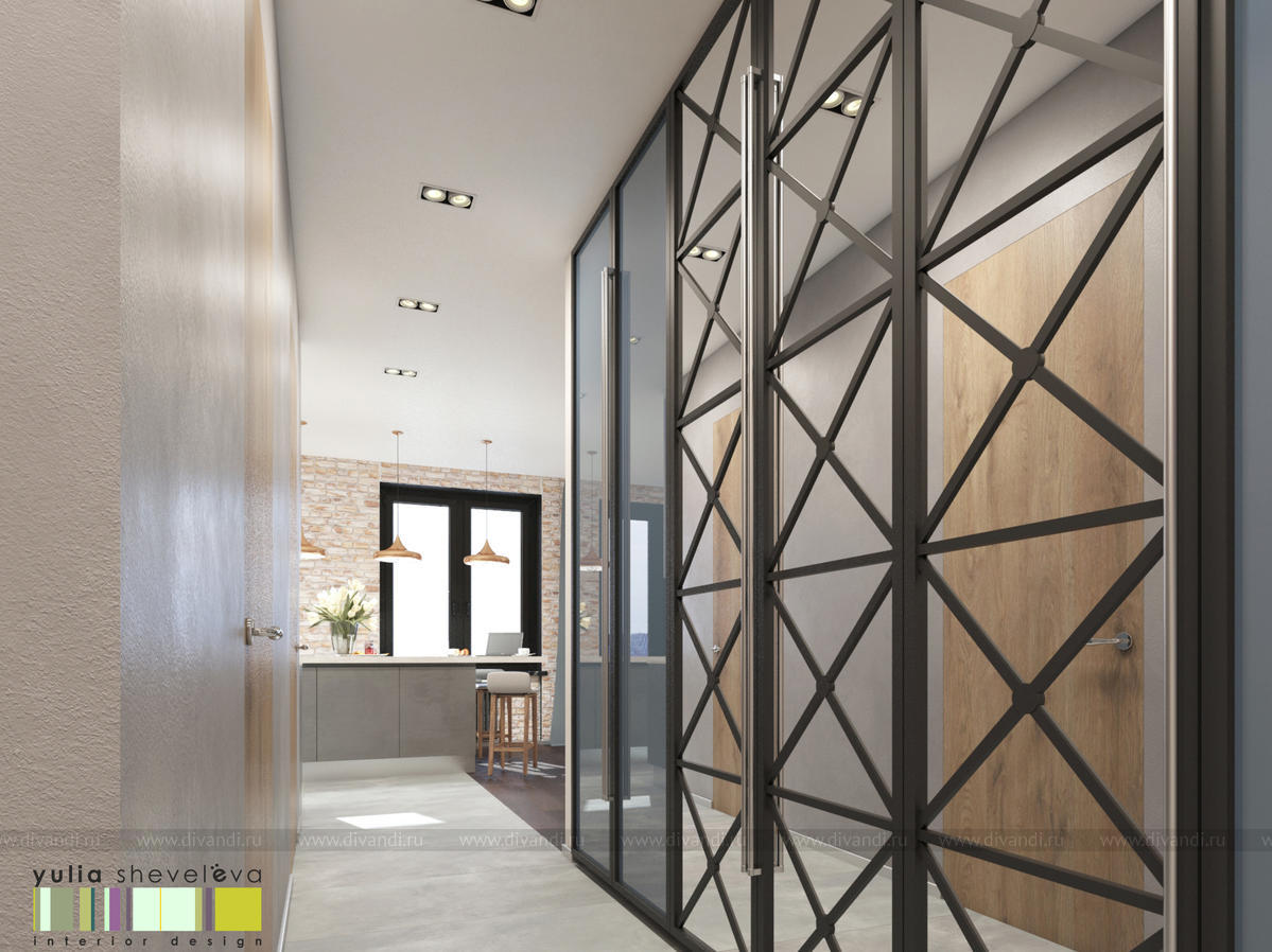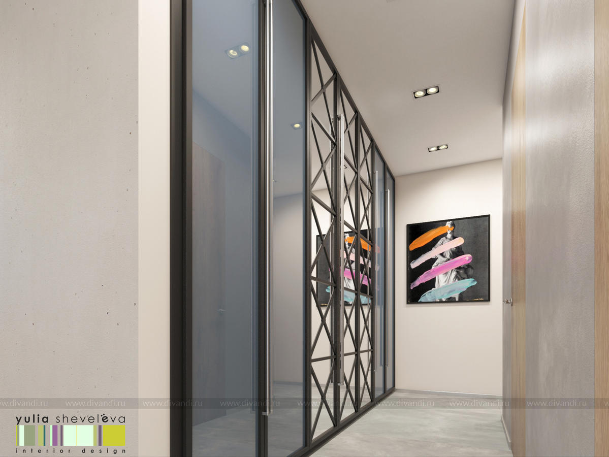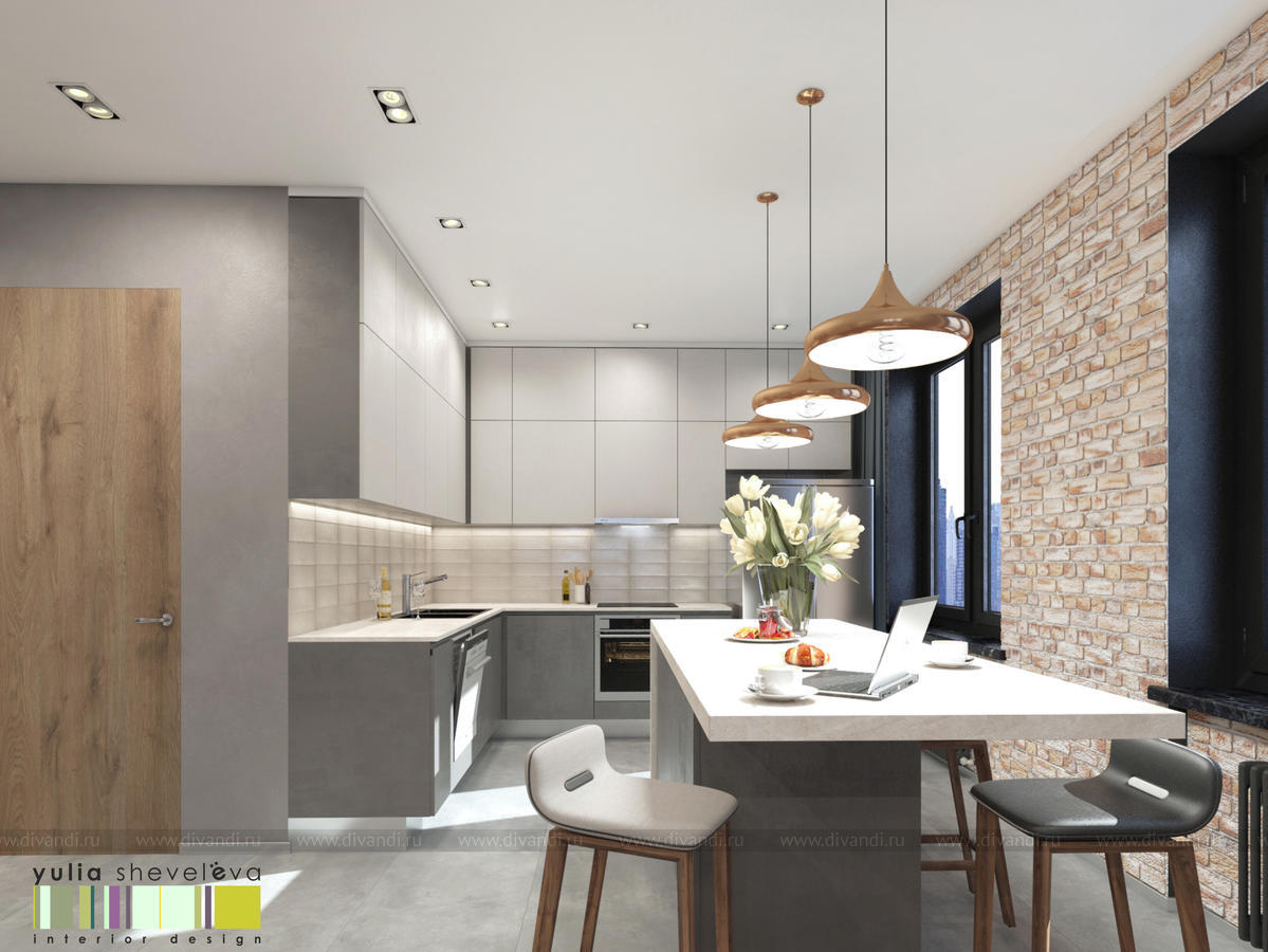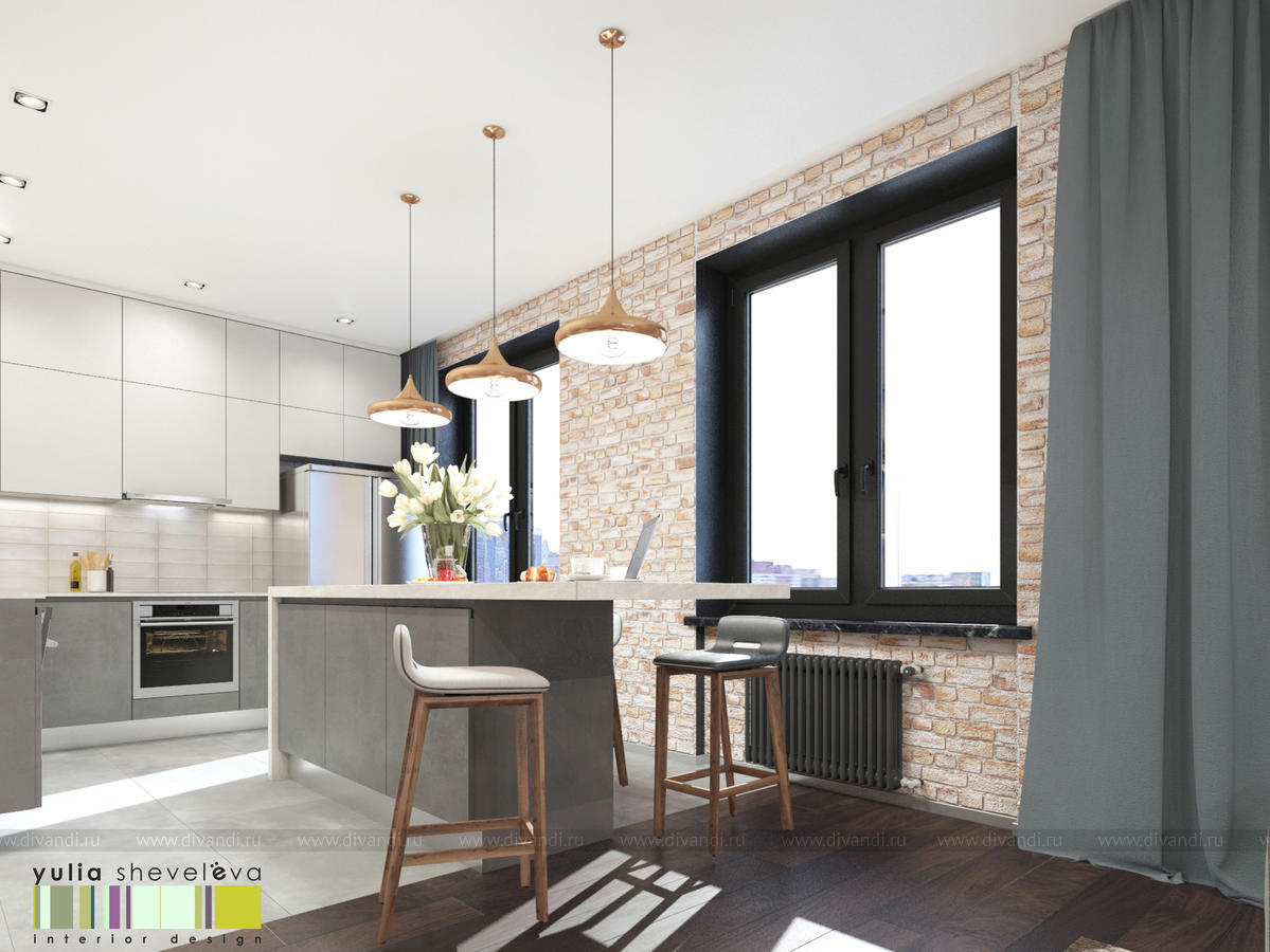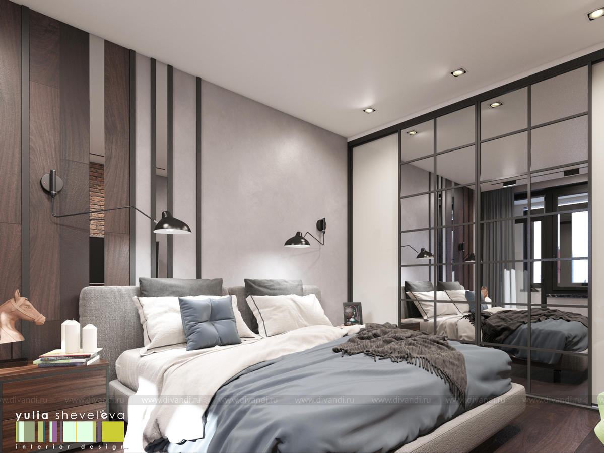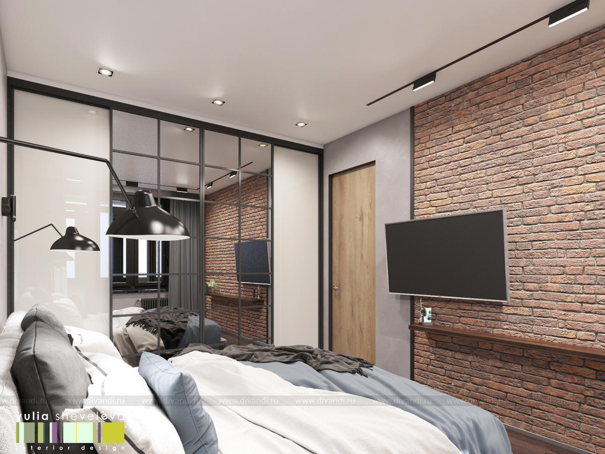 Сам интерьер квартиры решен в современном направлении с элементами стиля лофт. Гамма для всей квартиры была выбрана общая - это сочетание серого и графита, дерева и кирпича, стекла и черного металла.
