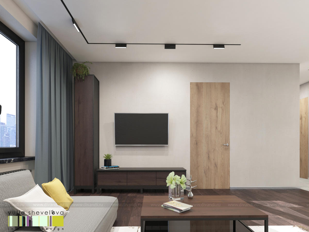 На входе встречает небольшая прихожая, далее по курсу просторный шкаф во всю длину стены, с зеркальными дверцами. Из холла попадаем в объединённую гостиную и кухню. Главная зона это остров на кухне - место обитания, работы и общения семейной пары.