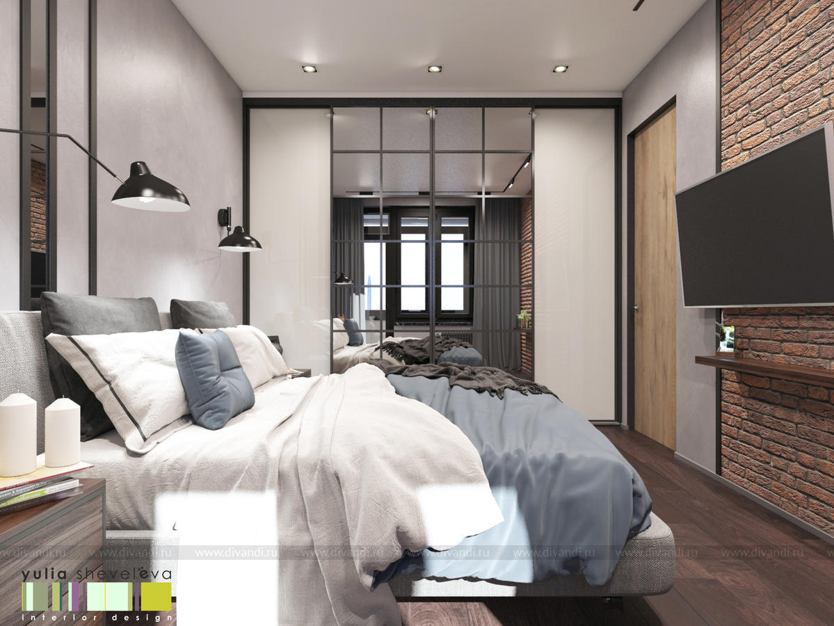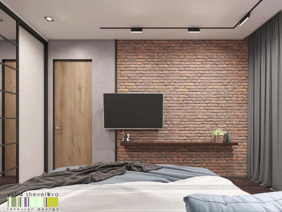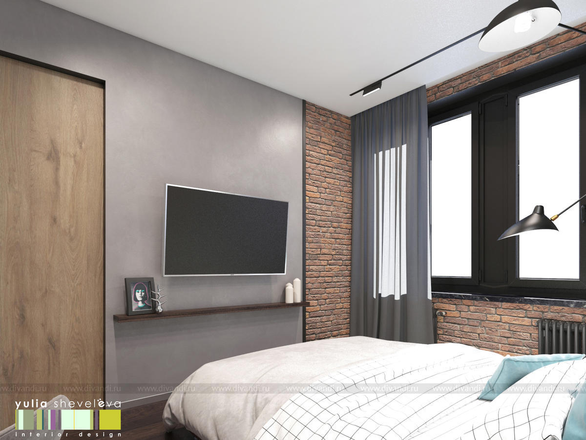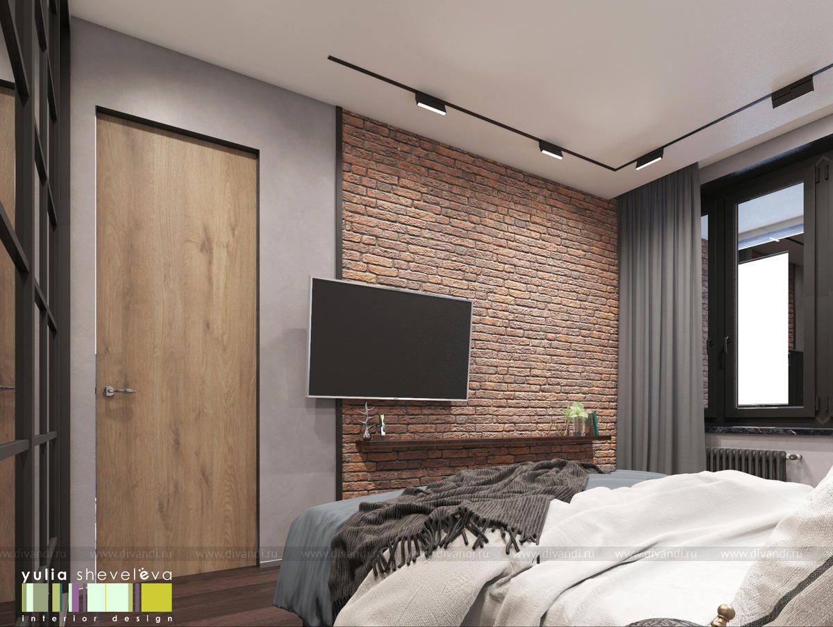 В гостиной уютный диван и зона для просмотра телевизора. Из гостиной ведет дверь в спальню, выполненную в таком же стиле, как и весь интерьер. Здесь не так много места, но основная задача стояла в том, чтобы максимально сделать удобное и функциональное пространство, разместить все необходимое