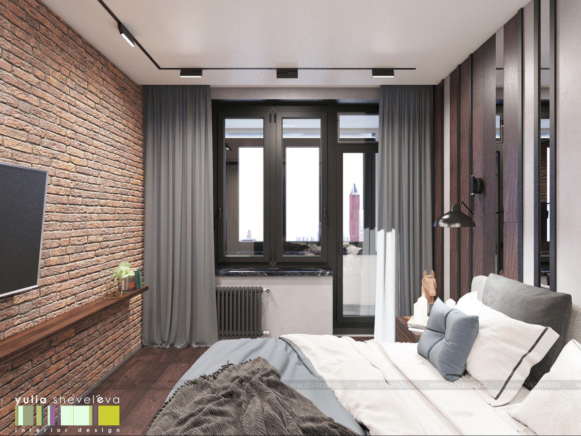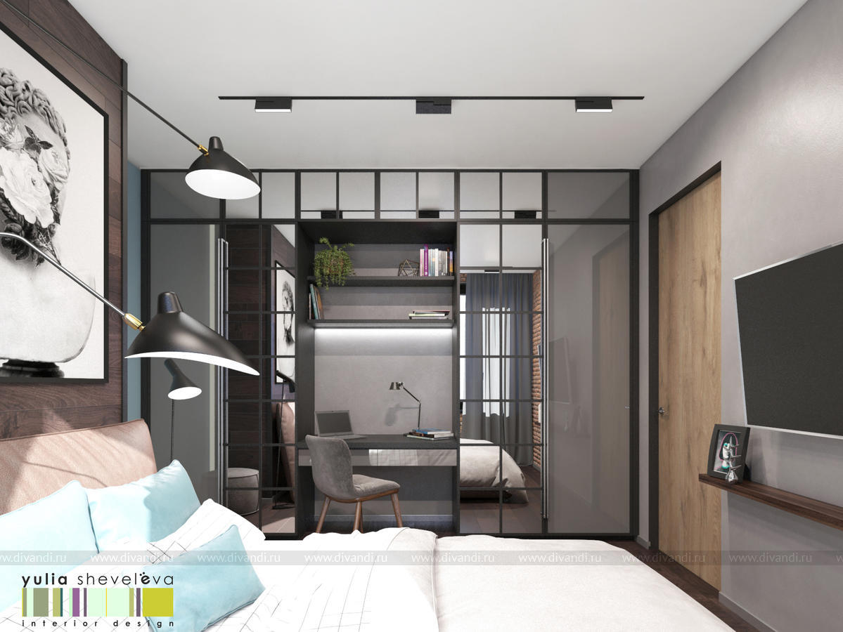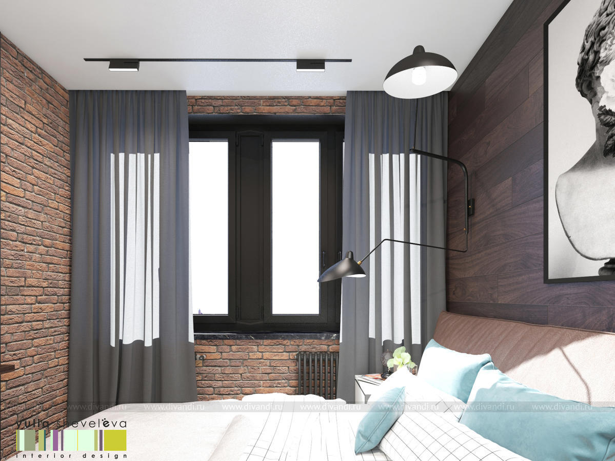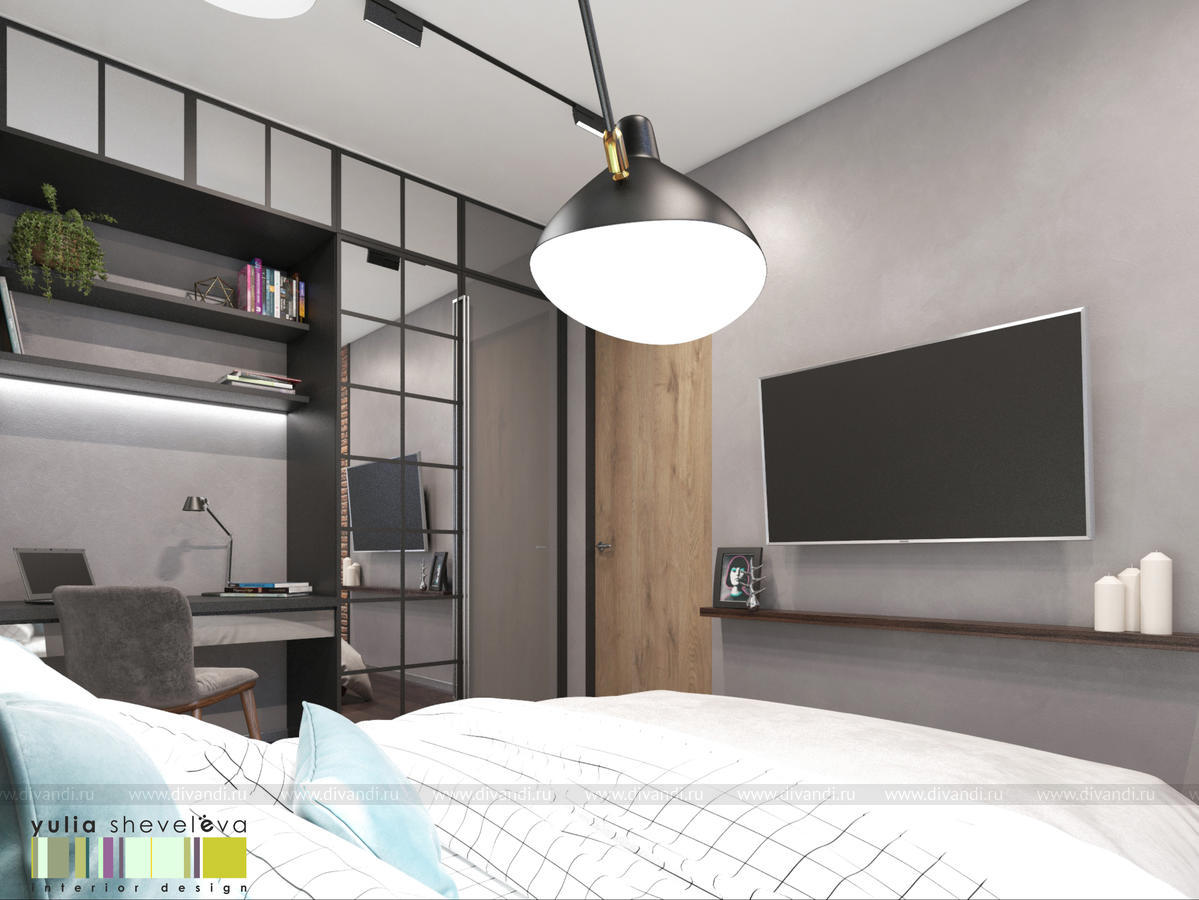 В гостиной уютный диван и зона для просмотра телевизора. Из гостиной ведет дверь в спальню, выполненную в таком же стиле, как и весь интерьер. Здесь не так много места, но основная задача стояла в том, чтобы максимально сделать удобное и функциональное пространство, разместить все необходимое