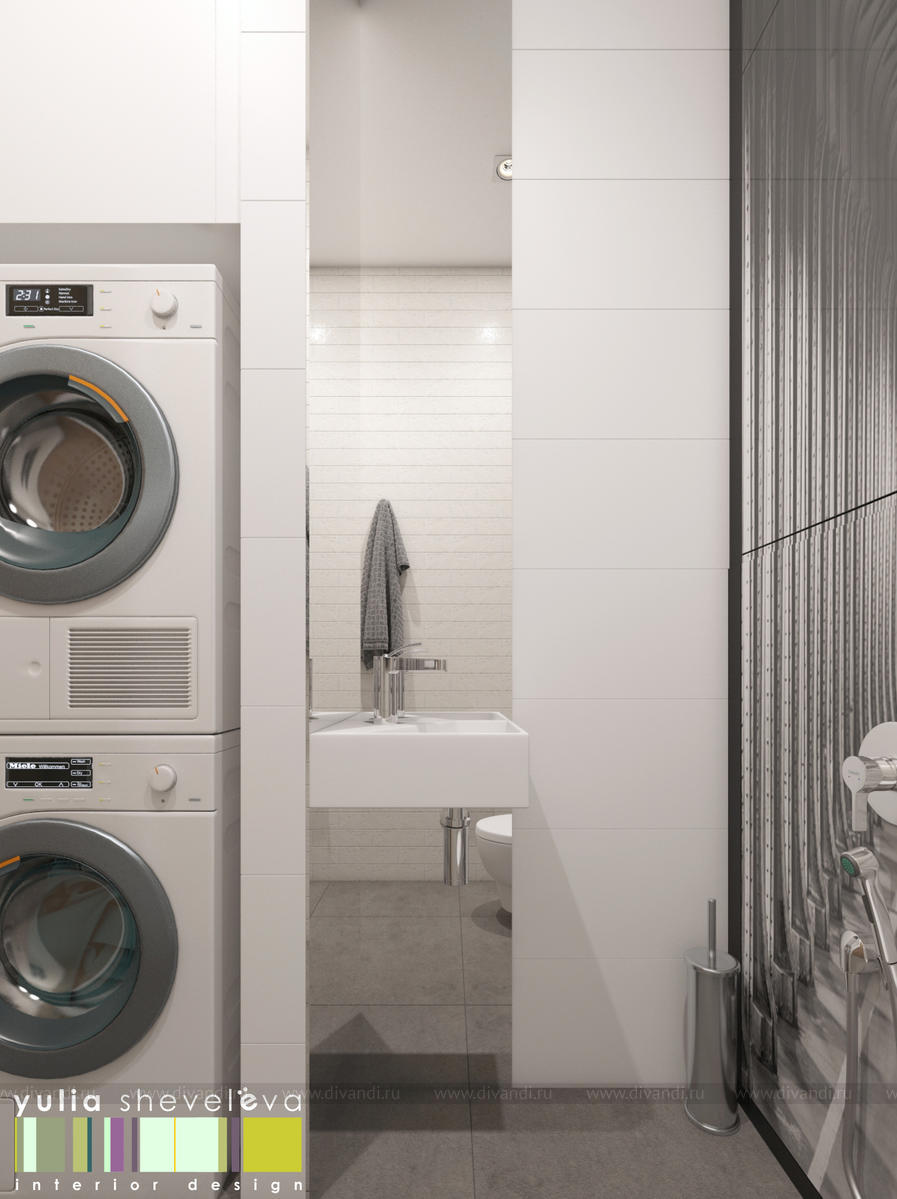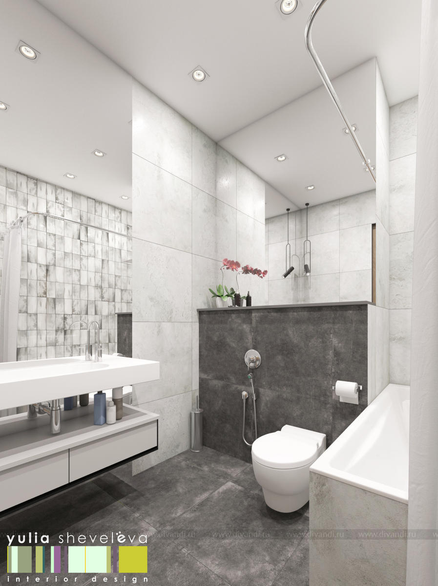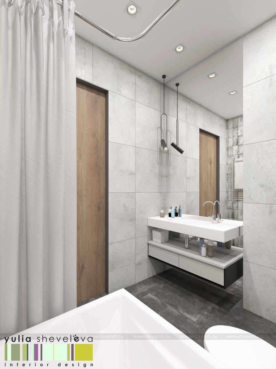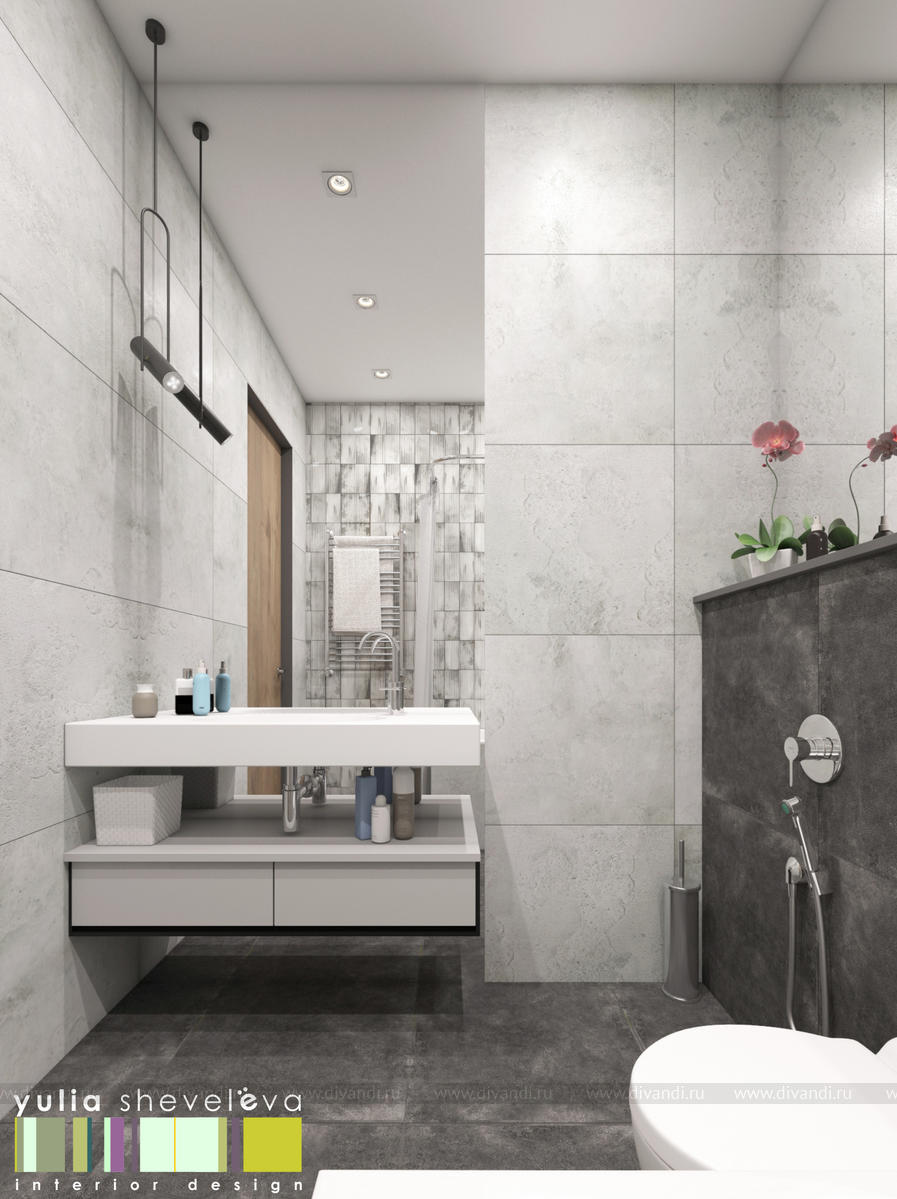 Ванные комнаты получились очень необычные. Они выполнены в монохромной гамме, акцент сделан на сложные фактуры и текстуры. Так в ванной комнате основная стена облицована серо-белой плиткой Diesel от Iris Ceramica. В дополнение к ней выбрана фоновая плитка «под бетон».
