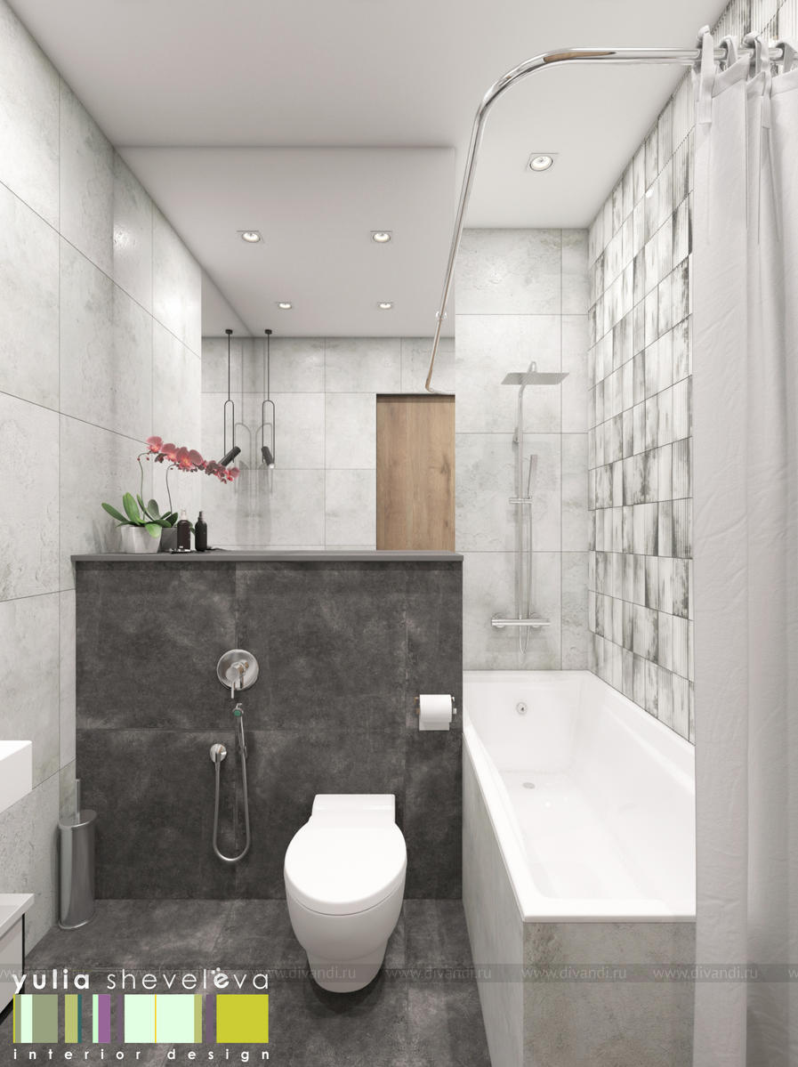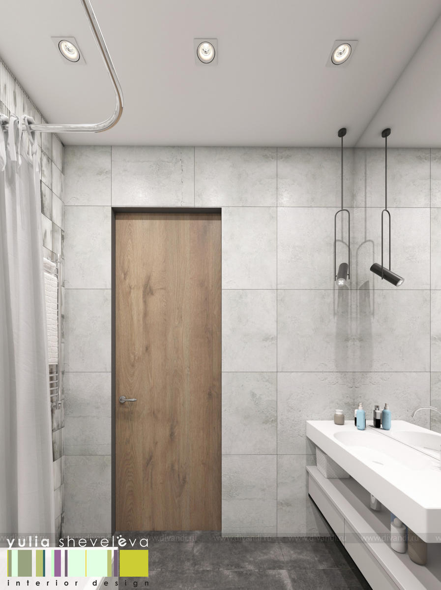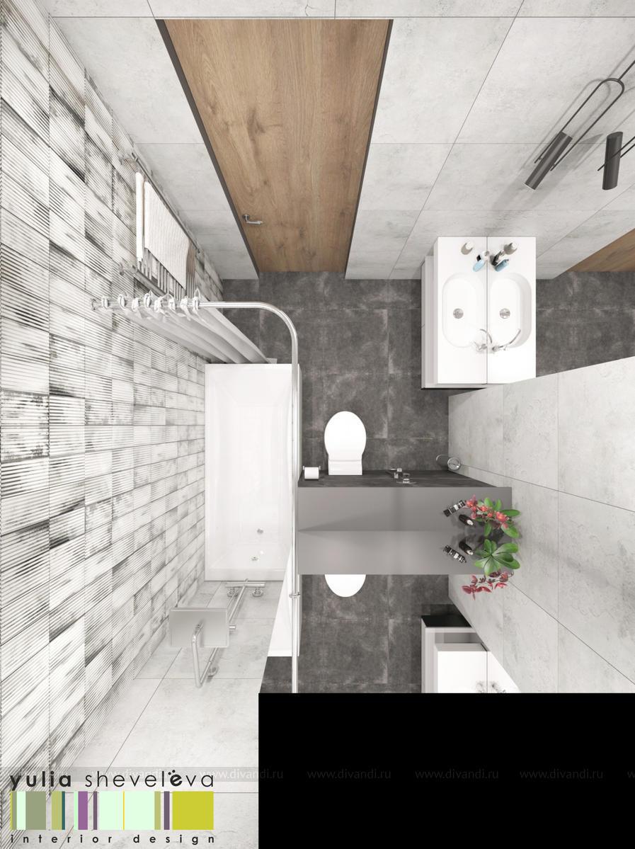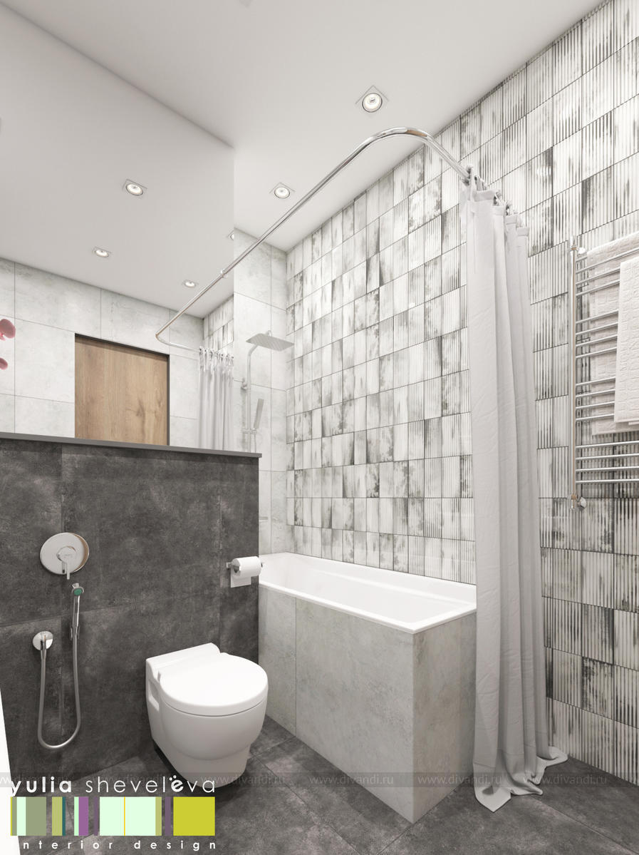 Ванные комнаты получились очень необычные. Они выполнены в монохромной гамме, акцент сделан на сложные фактуры и текстуры. Так в ванной комнате основная стена облицована серо-белой плиткой Diesel от Iris Ceramica. В дополнение к ней выбрана фоновая плитка «под бетон».