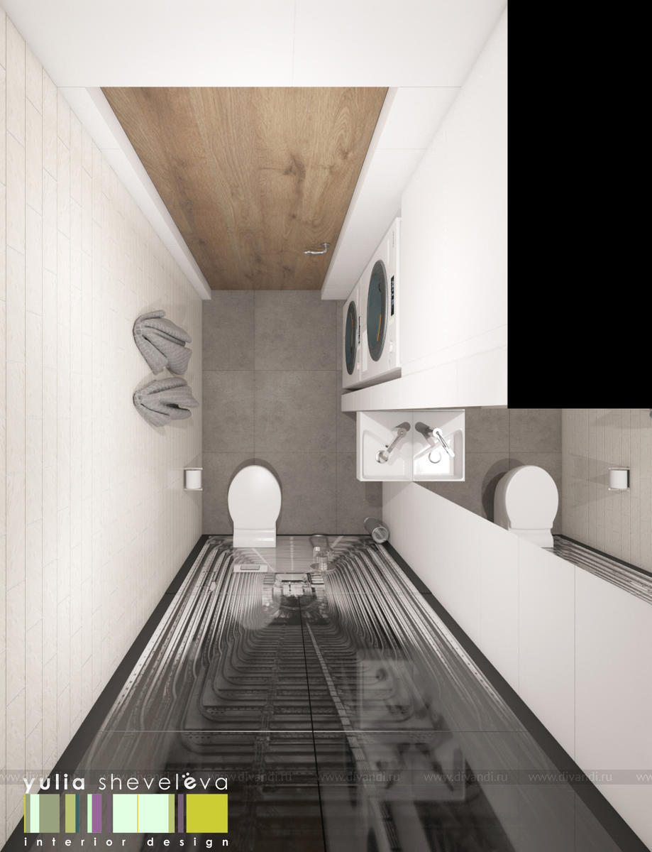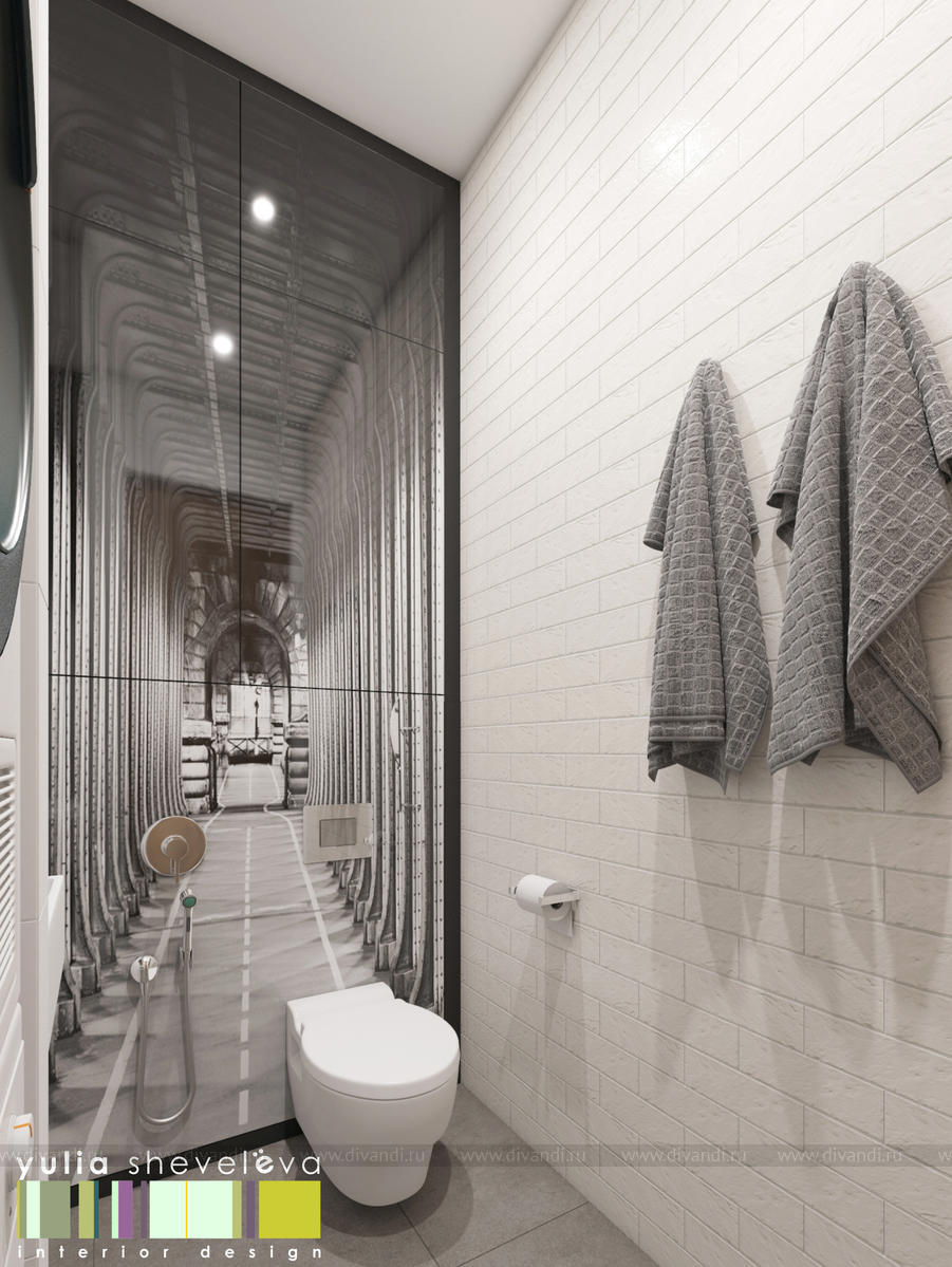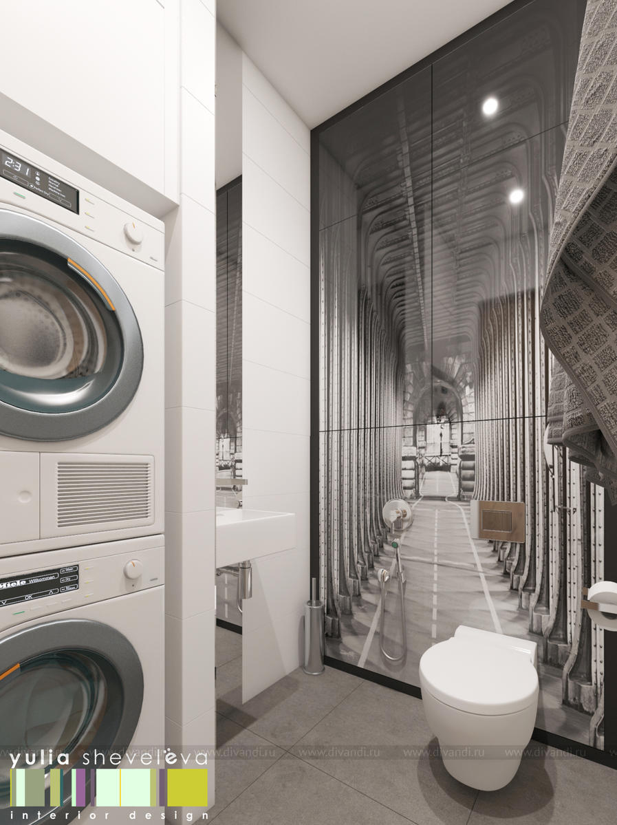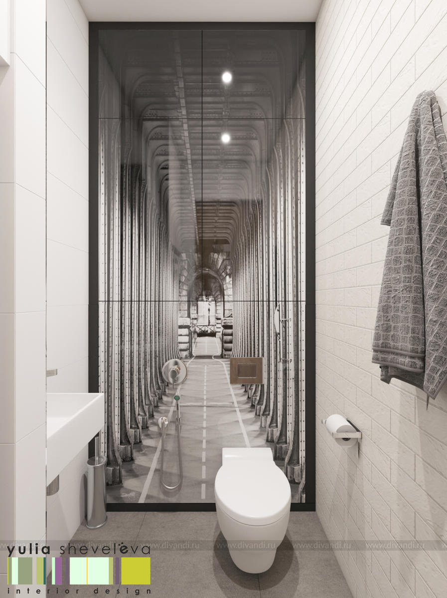 В санузле основной является стена с инсталляцией. Это стеклянная панель с печатью рисунка. Две верхних части являются створками шкафа, в котором прячется бытовая химия.