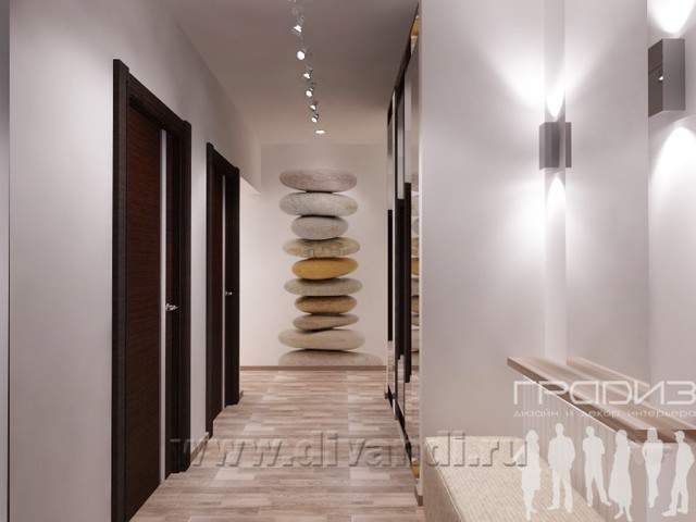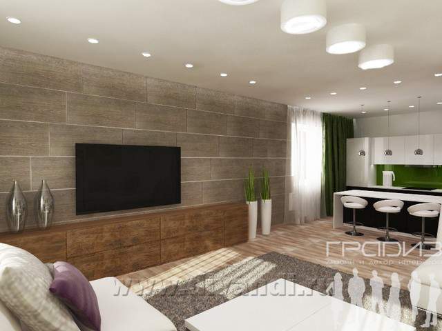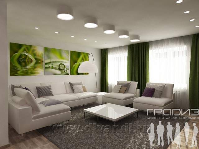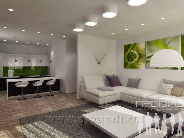 Заказчики приобрели уже готовый коттедж и хотели сделать его комфортным для себя. Решили объединить кухню с гостиной, добавить барную стойку для завтраков и организовать большую зону для приема гостей и отдыха. Вторая спальня не будет часто использоваться – это гостевая, где будет оставаться сын, который уже не живет с родителями. Ванная показалась Заказчикам маленькой, поэтому мы расширили ее за счет гостевой, стиральную машину убрали в шкаф. Аналоги Заказчики выслали смелые, яркие, светлые. В итоге интерьер получился очень позитивным. Близость к природе (коттедж находится в поселке) подчеркнута использованием природных (или имитирующих природные) материалов и цветов: шпонированные панели на стене в гостиной, принт с галькой на стене в прихожей, керамогранит под дерево в ванной, активный зеленый в гостиной.