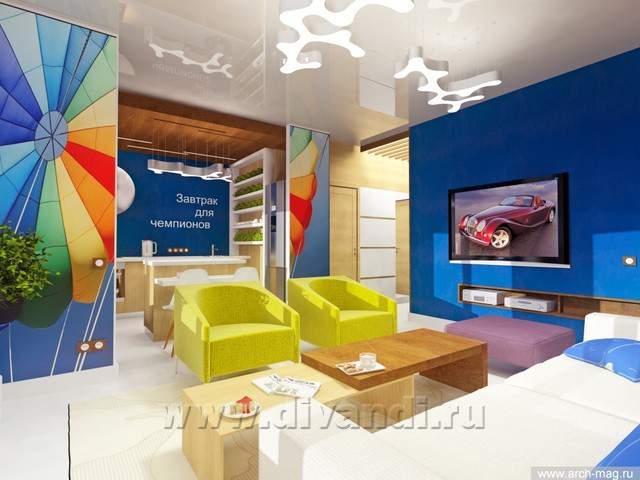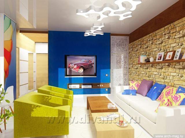 В зоне гостиной комнаты хотелось создать ощущение легкости и невесомости и в тоже время передать радость и веселье от путешествий и полетов, для этого мы сделали наливной пол, белый и дополнили натуральными материалами деревом и камнем добавив яркие пятна жизнерадостных, веселых принтов.