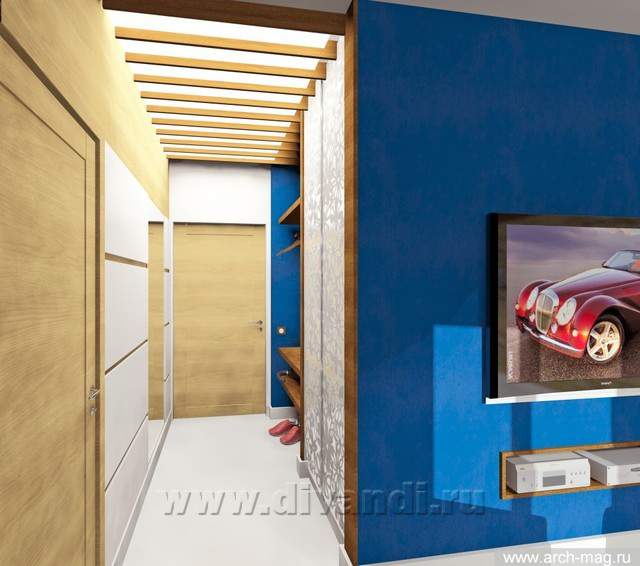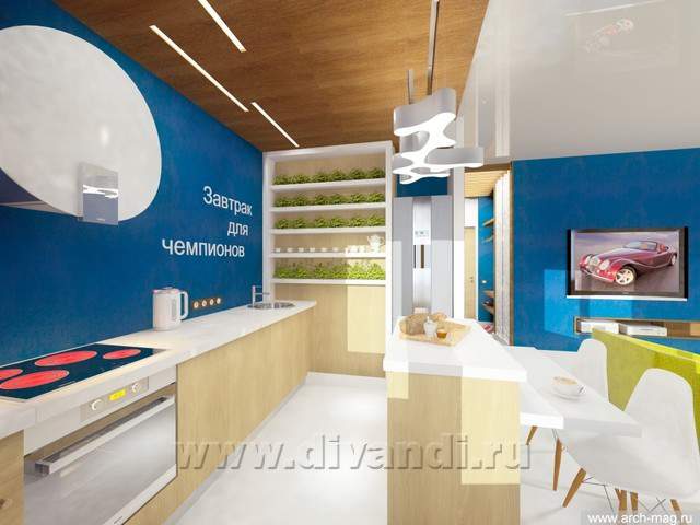 Стены отделяющие кухню оклеены принтами с ярким изображением воздушного шара. Данные перегородки расположены так что создается ощущение что они сдвигаются или раздвигаются и за ними открывая нам кухню.