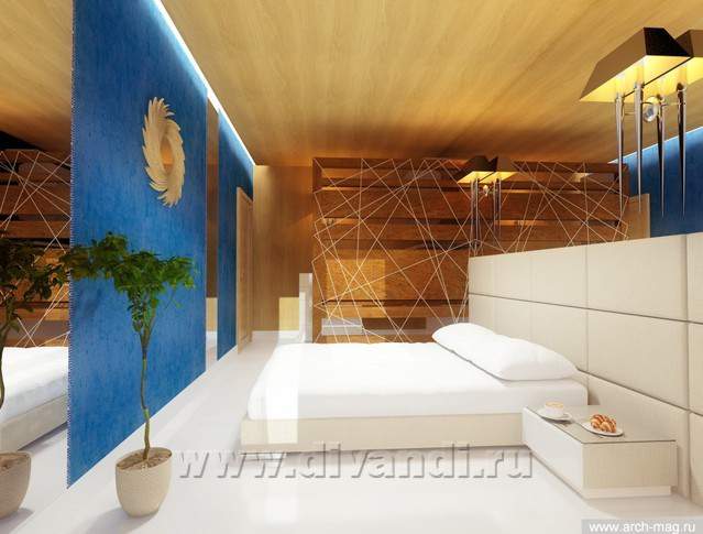 Спальня лаконична но в тоже время богата всякого рода фактурами натуральными и современными все это приправлено дико синим.