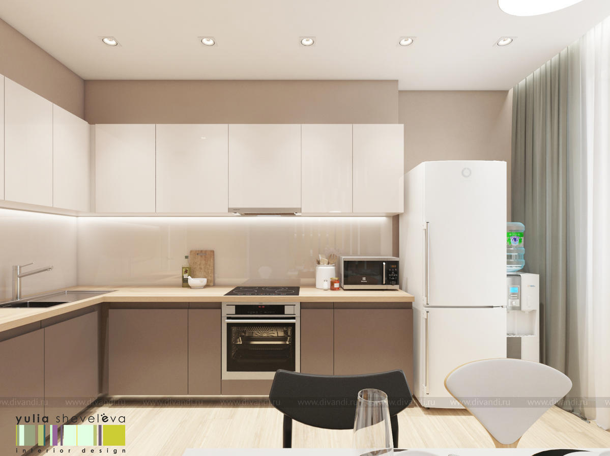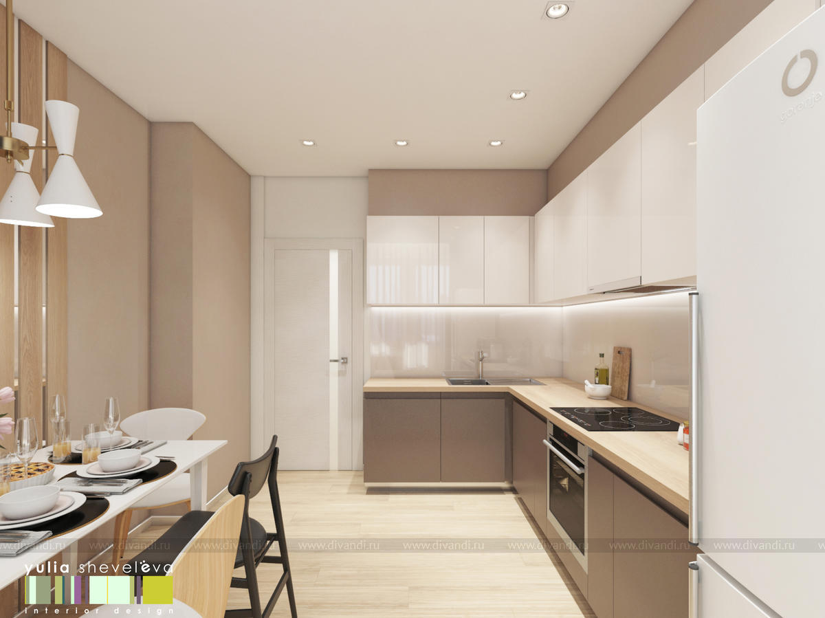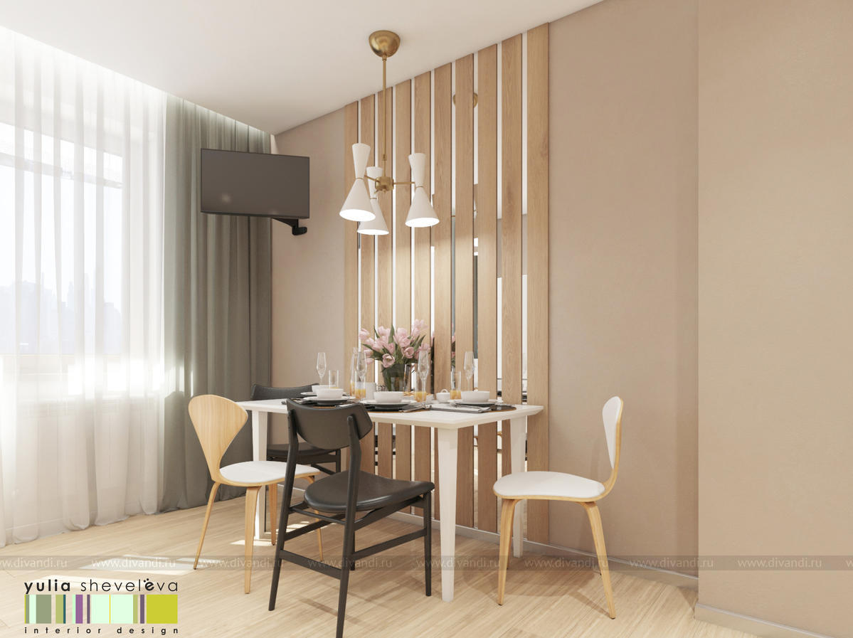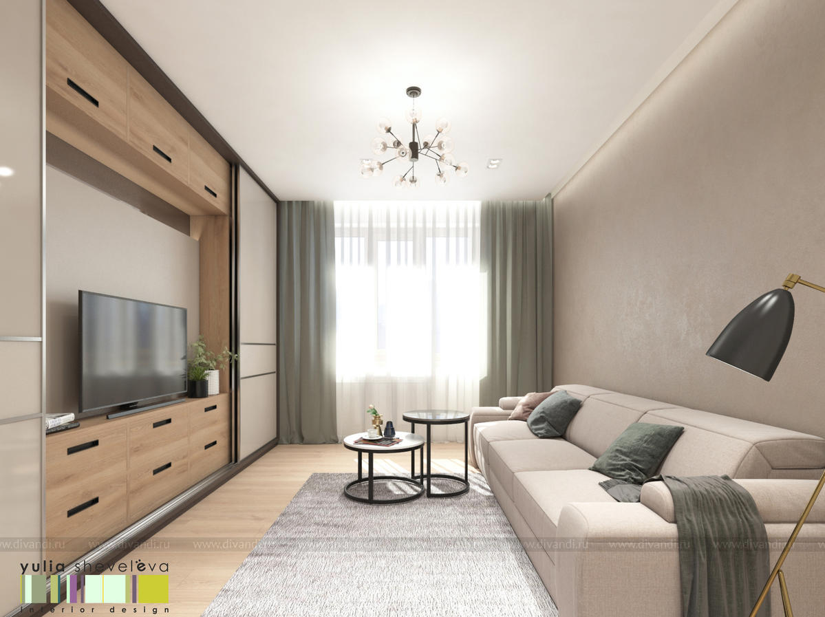 Стиль интерьера был выбран современный, с элементами эко стиля. Предпочтение было отдано теплой цветовой палитре, оттенкам бежевого, карамели, приглушенным зеленым тонам.