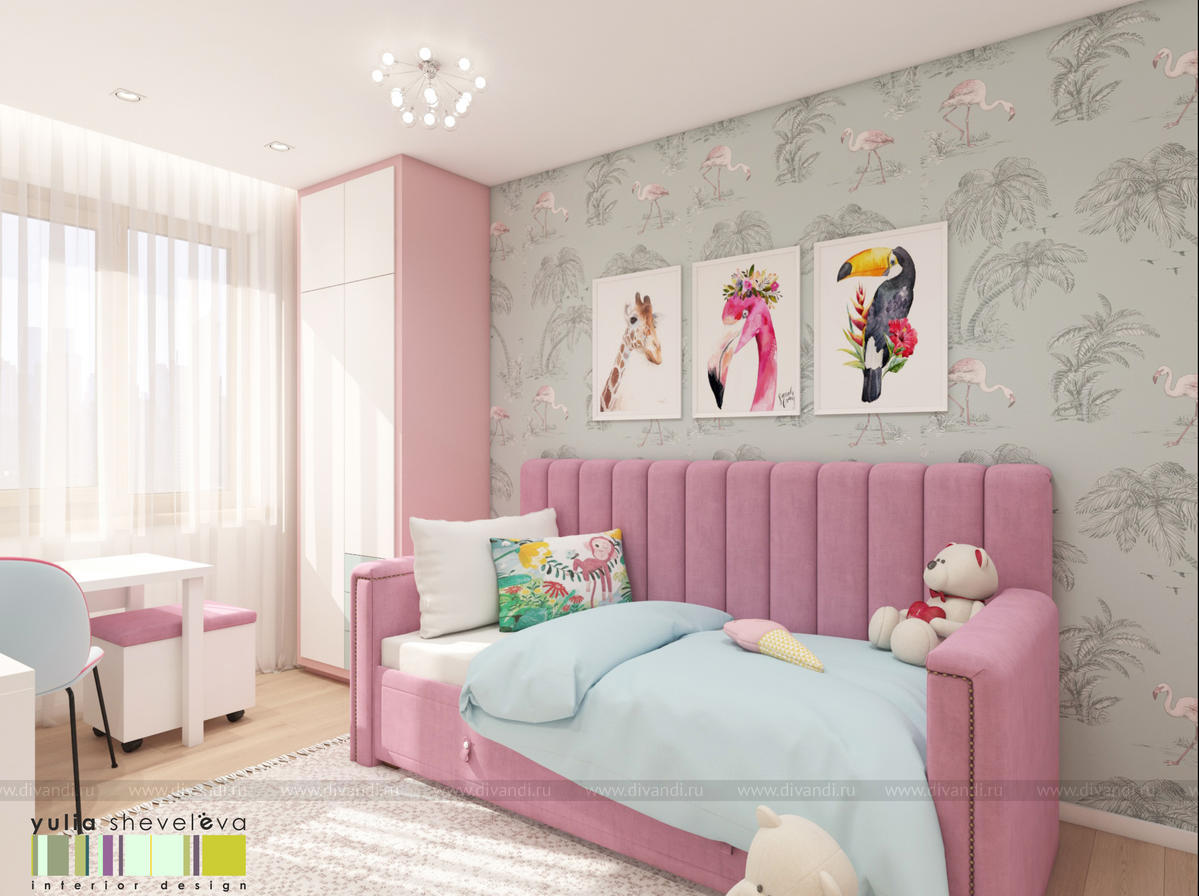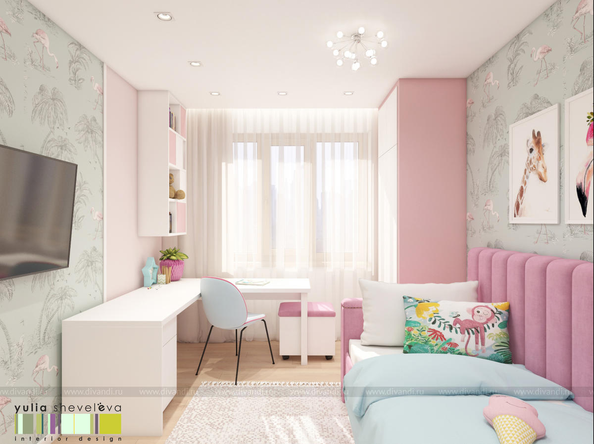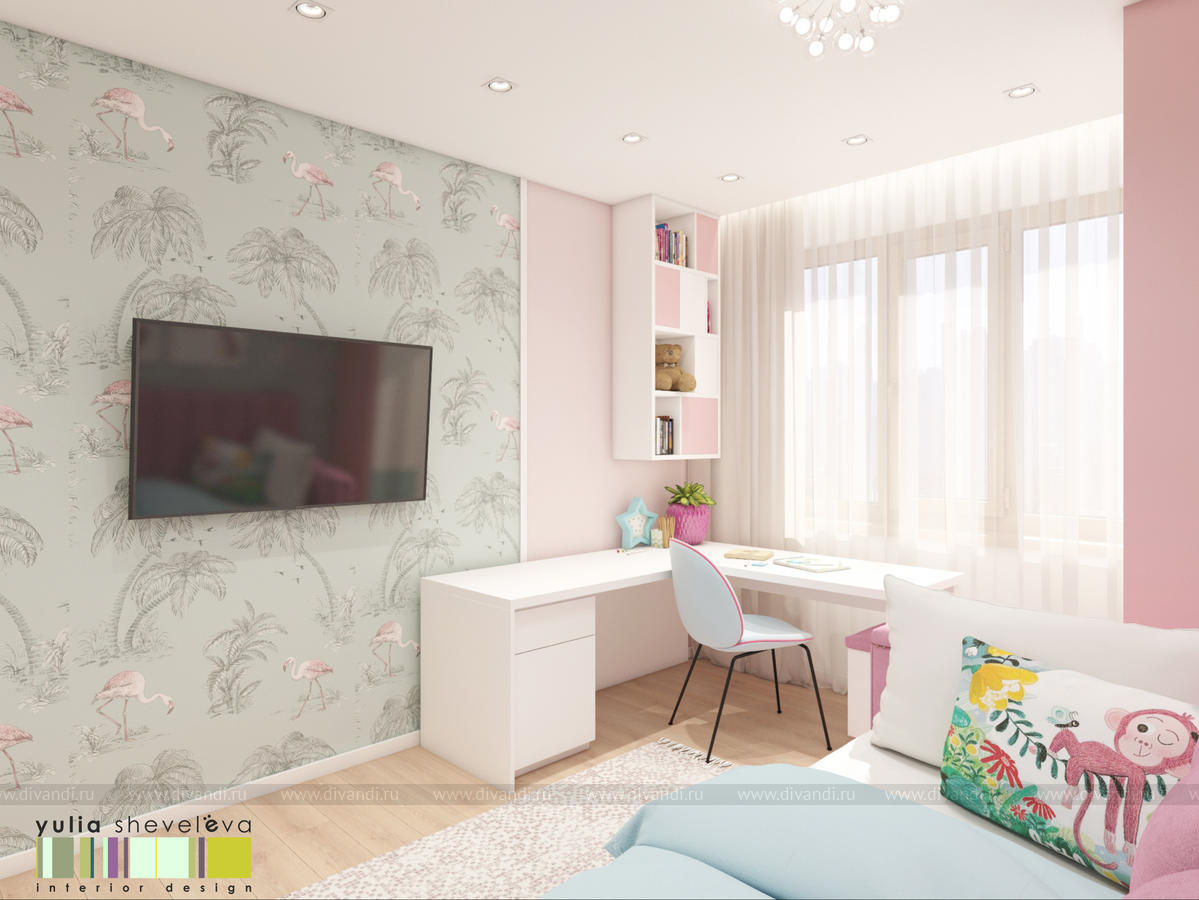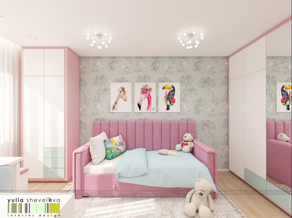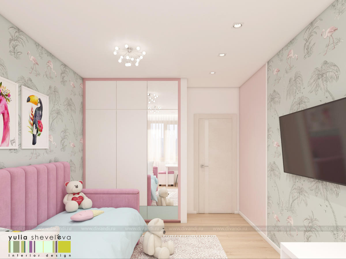 Особое место занимает детская комната для юной леди. По цвету и оформлению она отлична от остальной квартиры, выполнена в нежной, пастельной гамме.