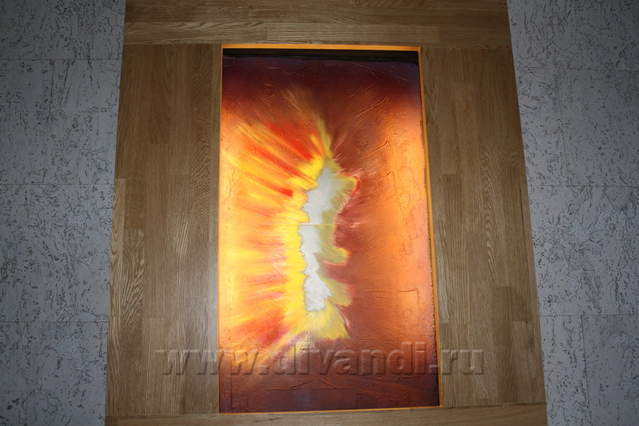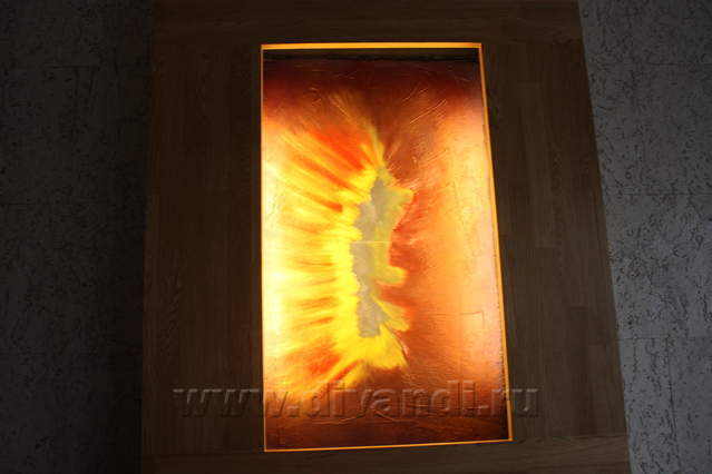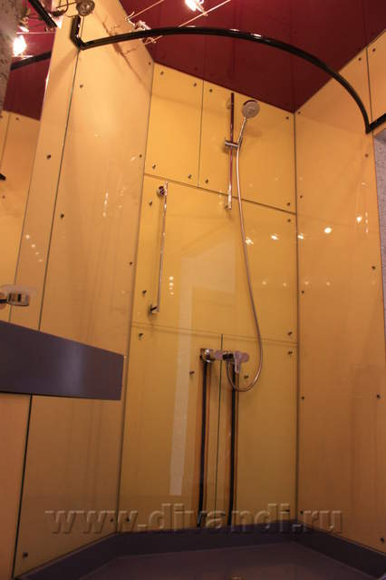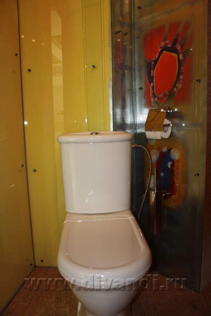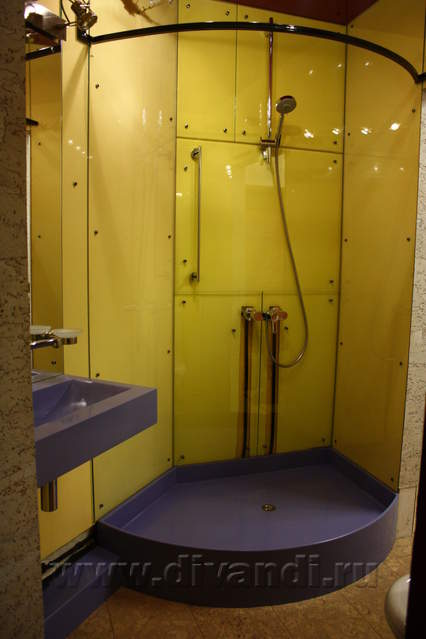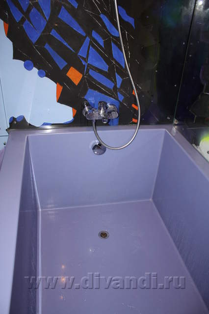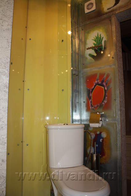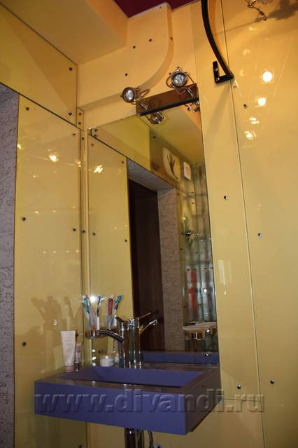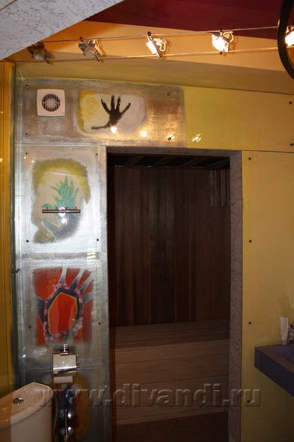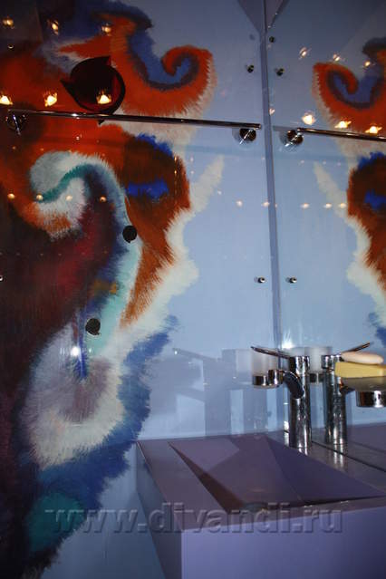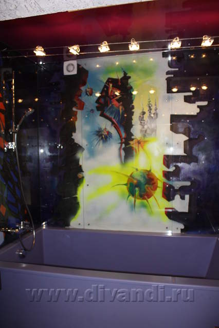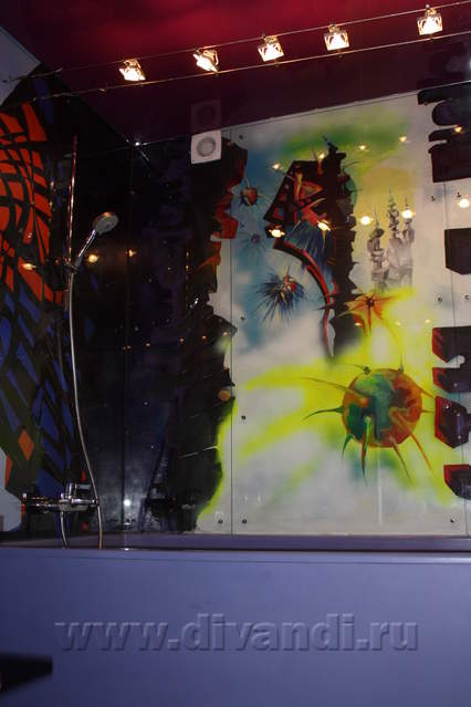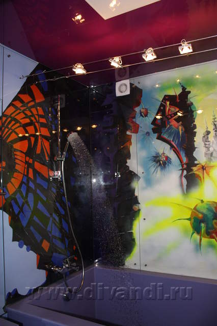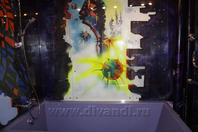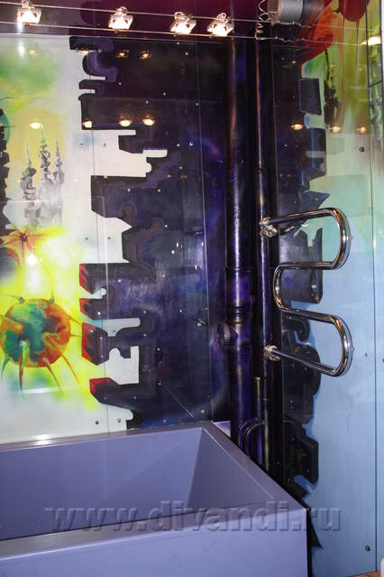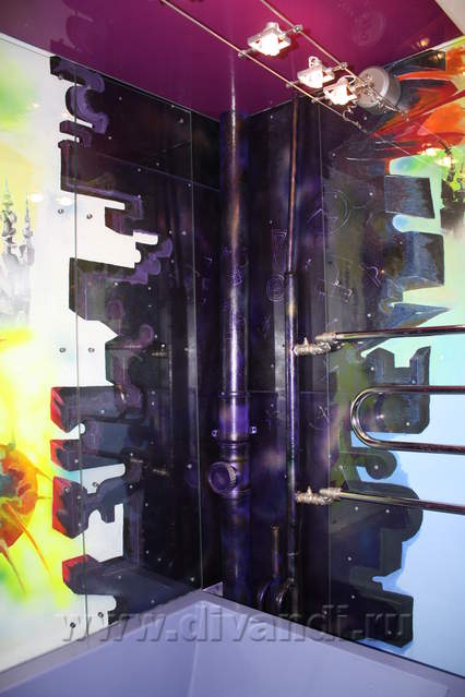 Ванная и душевая комнаты расписаны в авторском стиле «Эзотерика» водостойкими акриловыми красками. В качестве дополнительной защиты от влаги мы использовали восьмимиллиметровое закаленное стекло, в которое ‘обуты’ внутренние стены этих комнат. Сама ванная и раковины выполнены по желанию заказчика из акрилового камня, изначально обсуждалось, что водосточные и канализационные трубы станут элементами, дополняющими общую стилистику ванных комнат.