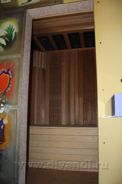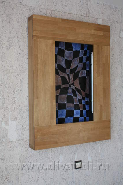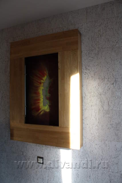 Еще два конструктивных элемента расположились в потолочных нишах для установки больших Ж.К. телевизоров таким образом, что сам телевизор при его ненадобности задвигается в эти ниши. Сама конструкция позволяет регулировать различные углы наклона для просмотра телевизора и имеет модуль регулирования скорости и радиоуправления. За основу тягового механизма мы использовали электролебедку, вмонтированную в пространство потолка.