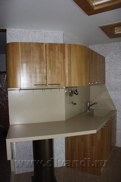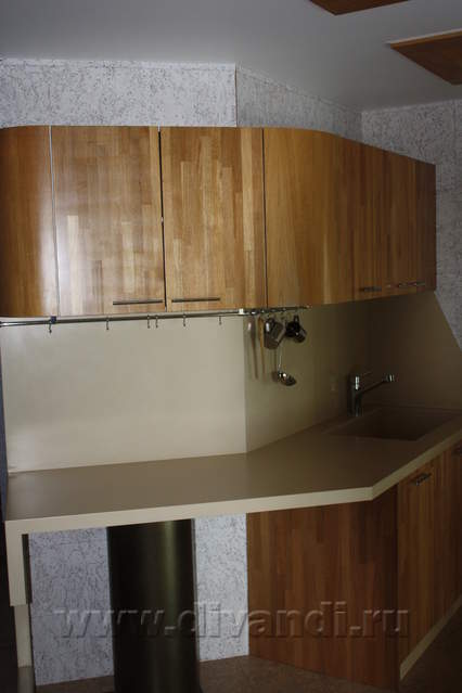 Первая из таких колонн установлена как опора большого кухонного стола, выполненного из акрилового камня, в центре которого вырезано круглое отверстие с потайной крышкой, установленного с ювелирной точностью в зазор всего в полтора миллиметра. Сам конструктивный элемент вмонтирован в основание колонны, куда и задвигается сам бар.