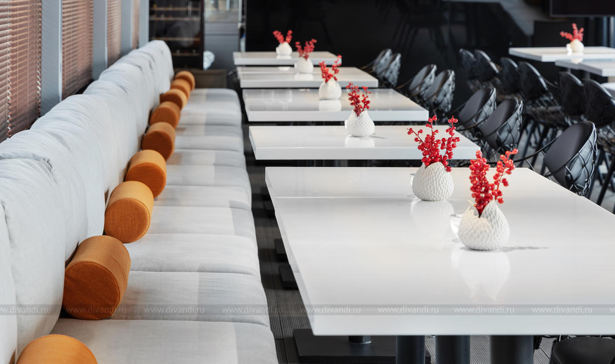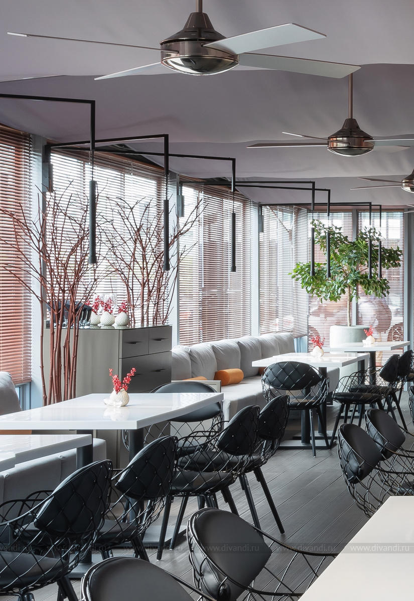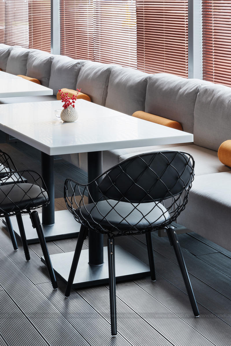 Ахроматическая цветовая схема (оттенки серого, графитовый, черный) разбавлена яркими линейными объектами — горизонтальные жалюзи медного оттенка, повторяющие фасадное решение отельного комплекса зданий, и подушки на диванах цвета шафран. Они и стали тем завершающим штрихом, который подобно кулинарной пряности, обогащает и украшает «блюдо».