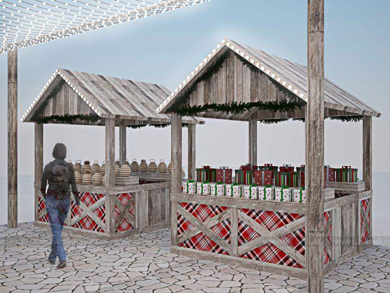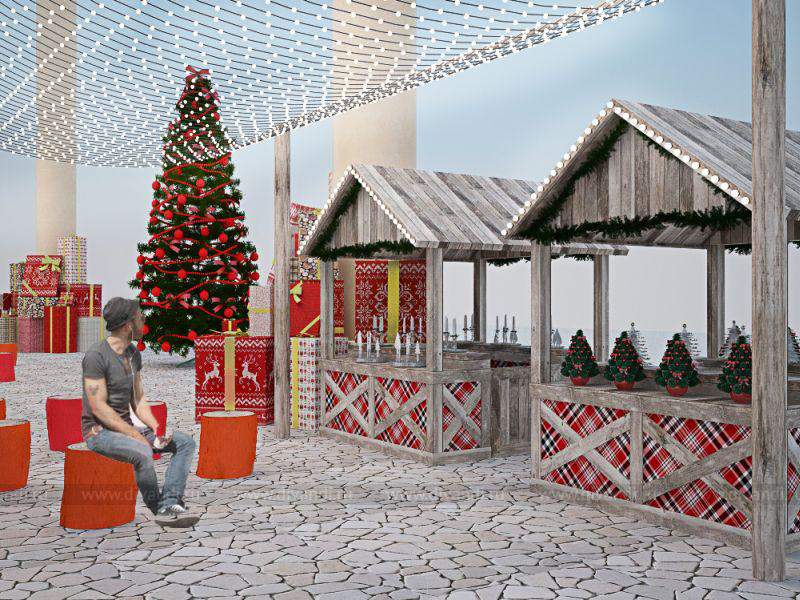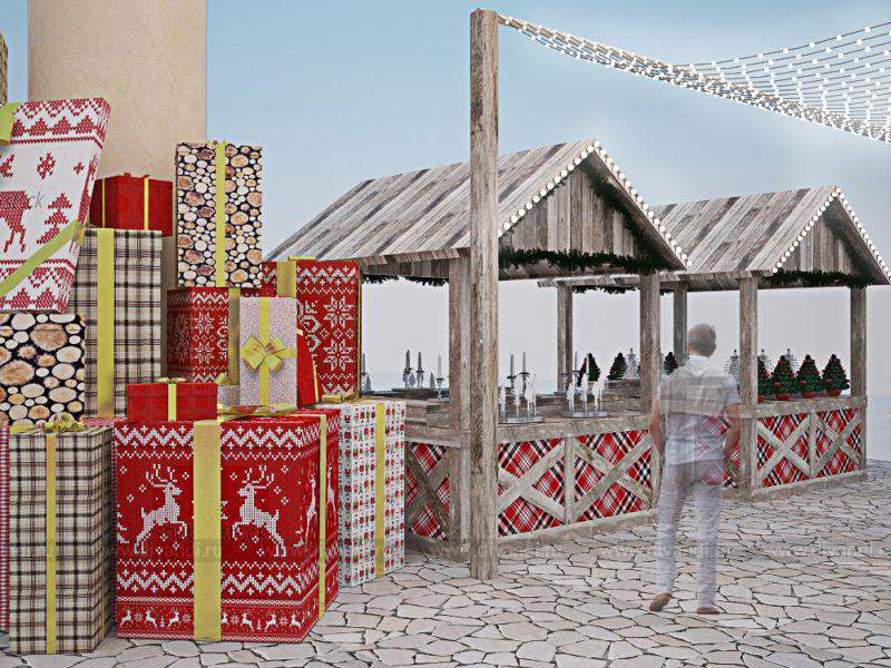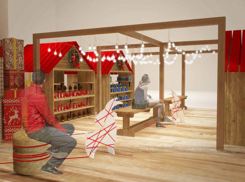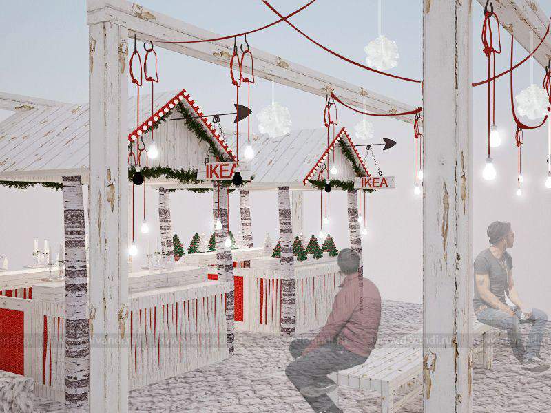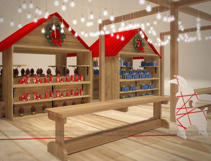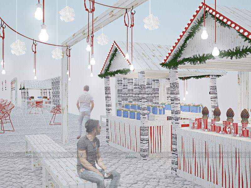 Дизайнерами студии "Градиз" было предложено 3 варианта - "европейская улочка", "год деревянной козы" и "снежный лес". В каждом из этих вариантов акцент сделан на том или ином символе зимы и Нового года - гирлянды из фонарей, искусственно состаренное дерево, деревянная коза как символ наступающего года, снег.