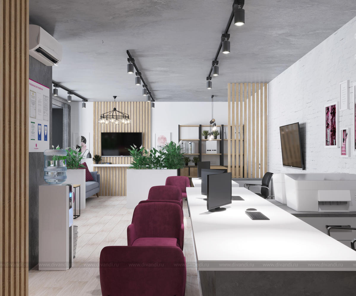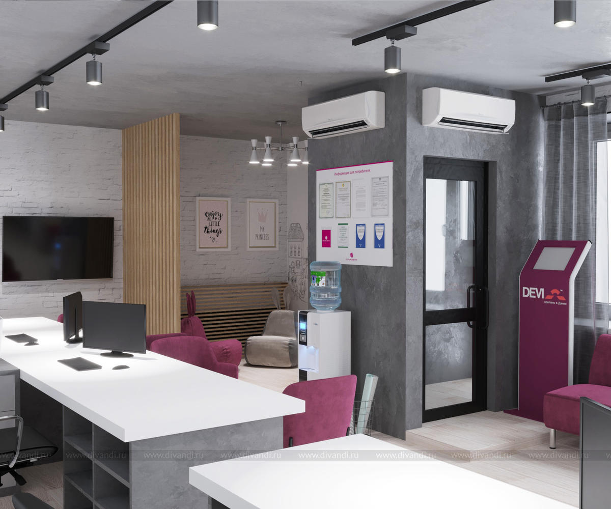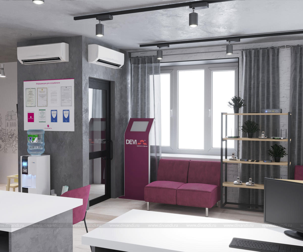 Наша студия разработала дизайн проект офиса продаж для известного интернет провайдера в Екатеринбурге "Планета". Заказчик выбрал стиль "Лофт" и попросил, чтобы в деталях интерьера был их фирменных розовый цвет. Так же мы предусмотрели детскую игровую комнату для детей посетителей офиса.