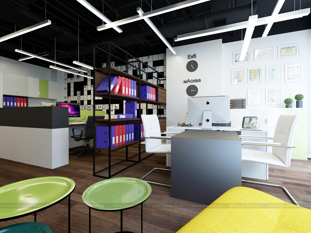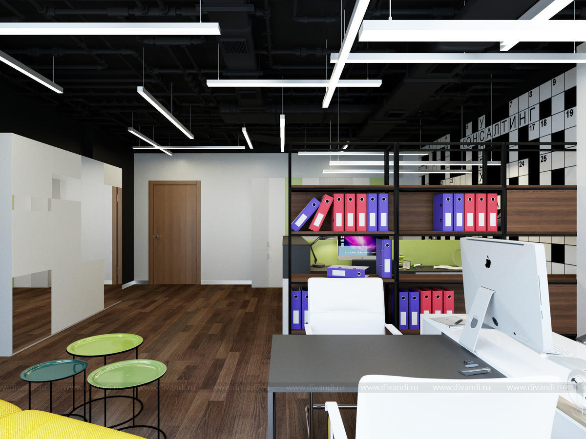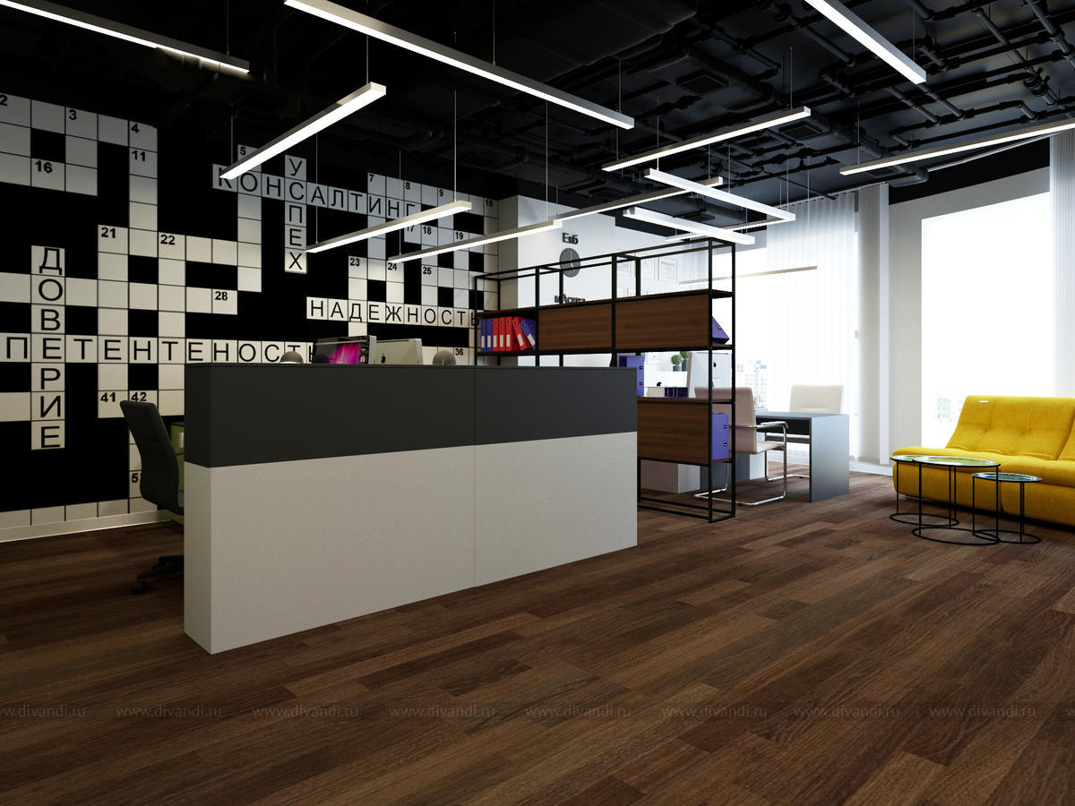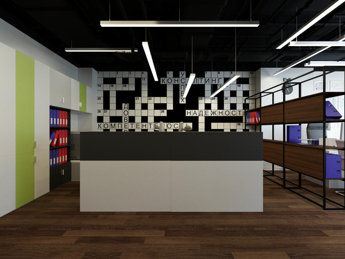 Заказчикам ранее уже разрабатывалось два проекта по квартирам, на этот раз обратились за дизайном офиса. Очень смелые по натуре заказчики, поэтому проект получился интересным и был сделан на одном дыхании. Т.к. в офисе все зашито потолками и терялась при этом высота помещения, решено было все демонтировать и обнажить все коммуникации и проводки. Выкрасить черный цветом все, но главная фишка помещения в графике на стене. У фирмы нет своего логотипа, он им не нужен, работают в самых узких кругах и в рекламе не нуждаются, решено было сделать кроссворд и вписать слова, характеризующие направление их деятельности. Идея была принята на ура, на данный момент идет успешная реализация.