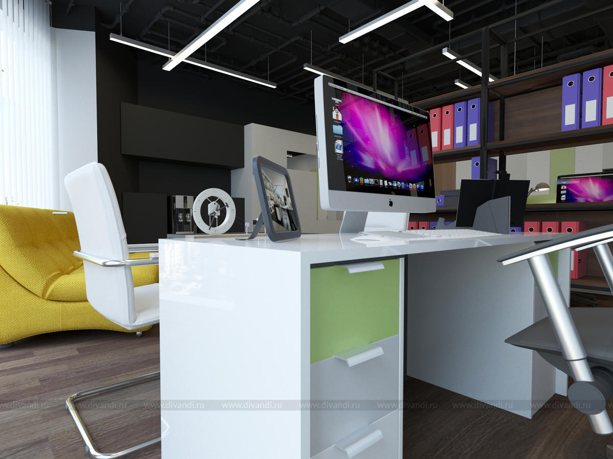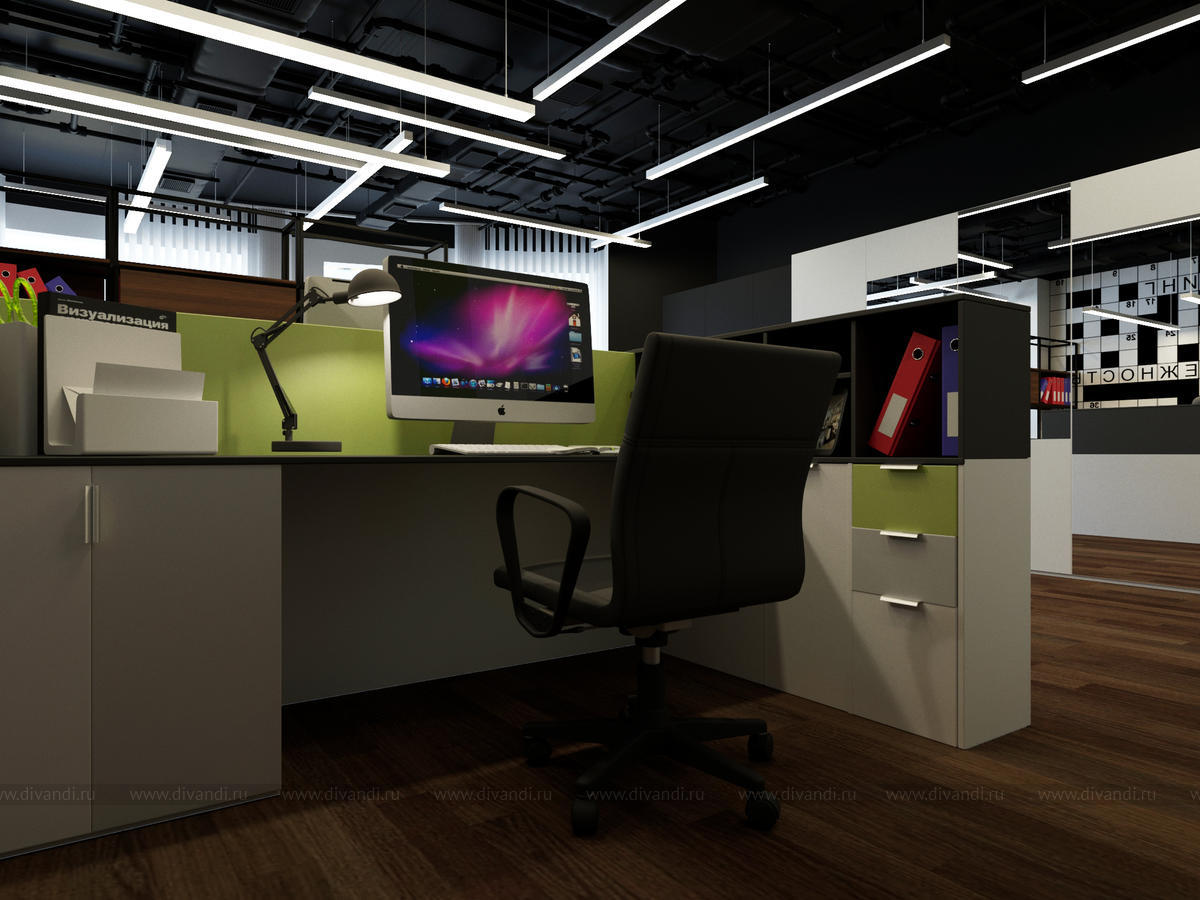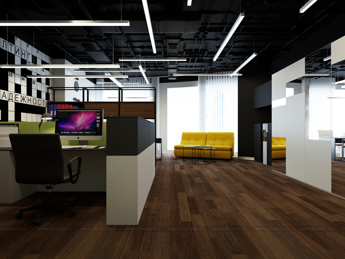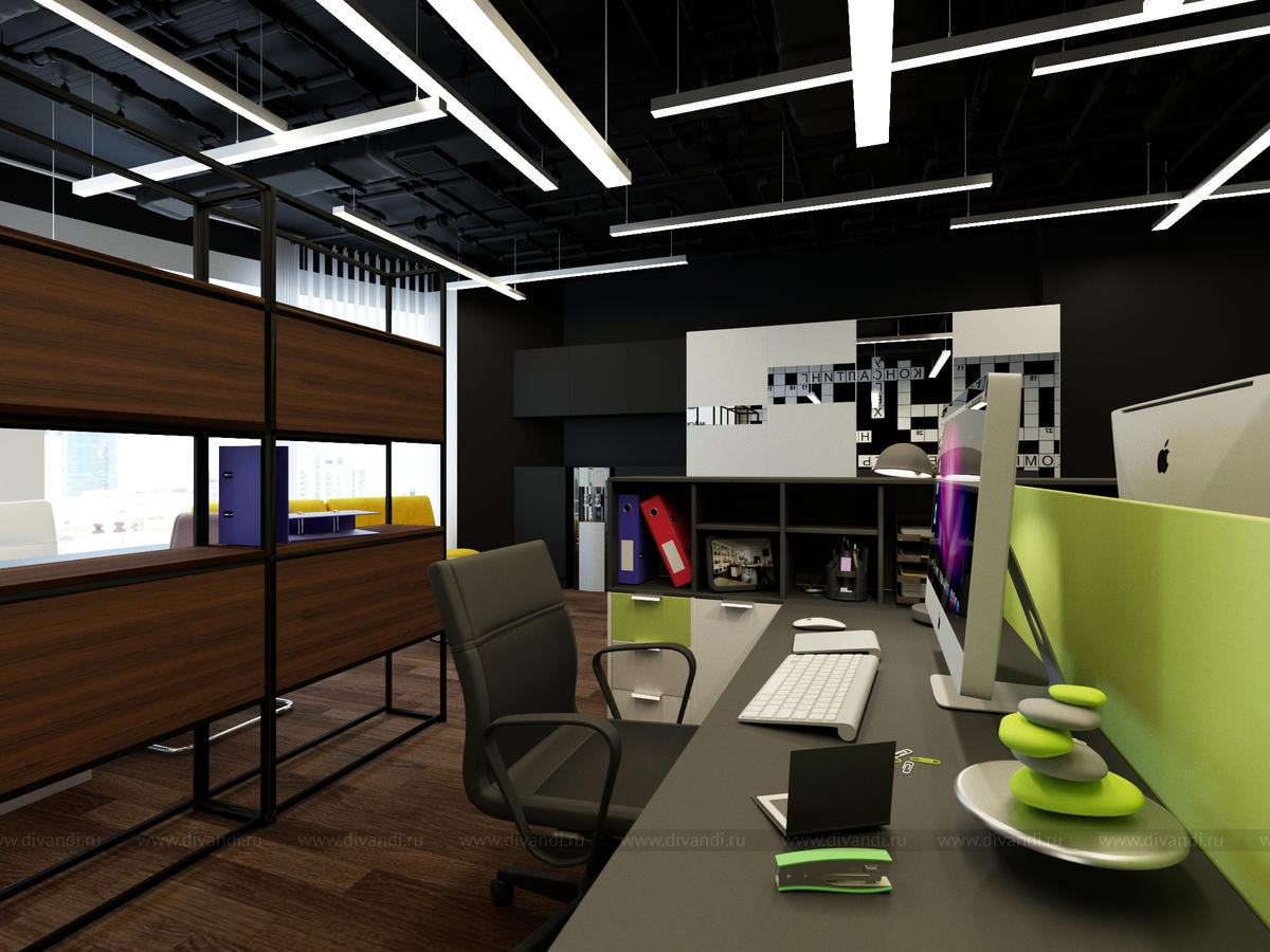 Заказчикам ранее уже разрабатывалось два проекта по квартирам, на этот раз обратились за дизайном офиса. Очень смелые по натуре заказчики, поэтому проект получился интересным и был сделан на одном дыхании. Т.к. в офисе все зашито потолками и терялась при этом высота помещения, решено было все демонтировать и обнажить все коммуникации и проводки. Выкрасить черный цветом все, но главная фишка помещения в графике на стене. У фирмы нет своего логотипа, он им не нужен, работают в самых узких кругах и в рекламе не нуждаются, решено было сделать кроссворд и вписать слова, характеризующие направление их деятельности. Идея была принята на ура, на данный момент идет успешная реализация.