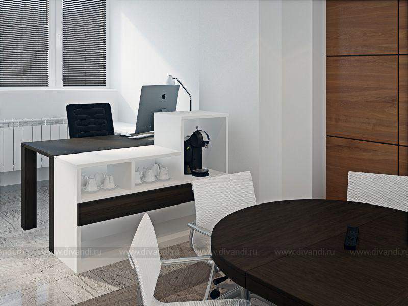 Мы разработали дизайн-проект кабинета, удобного во всех смыслах и вдохновляющего на работу. Чтобы увеличить площадь помещения до 23, 5 кв.м., дизайнеры решили объединить кабинет с просторной лоджией. Это позволило поставить в центре стол для переговоров на шесть человек, а в зоне лоджии организовать рабочее место и небольшую зону для отдыха.