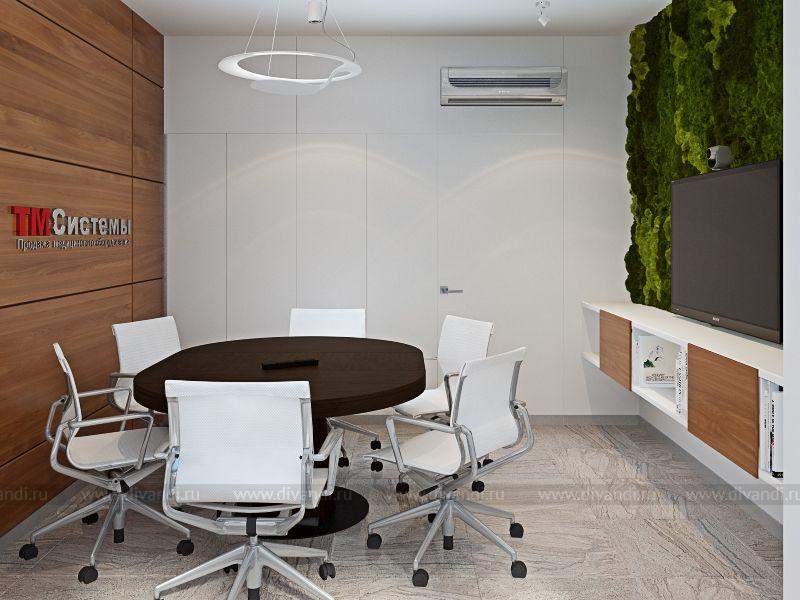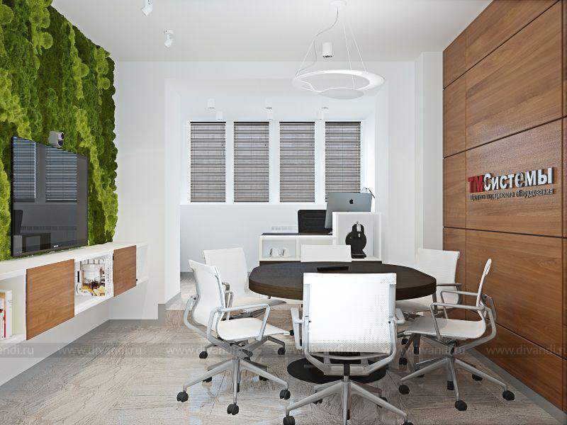 Несмотря на свою природную органичность, в интерьере много контрастов: глянцевая поверхность пола и матовая поверхность стен, яркие акценты дерева и зелени на белоснежных стенах, прямоугольные деревянные панели и подвесной светильник бионической формы, темно-коричневый массивный стол и легкие белые стулья. Благодаря контрастам, интерьер не выглядит скучным, но при этом в нем сохранена должная рабочему кабинету строгость, парадность и возможность настроиться на продуктивный рабочий процесс.