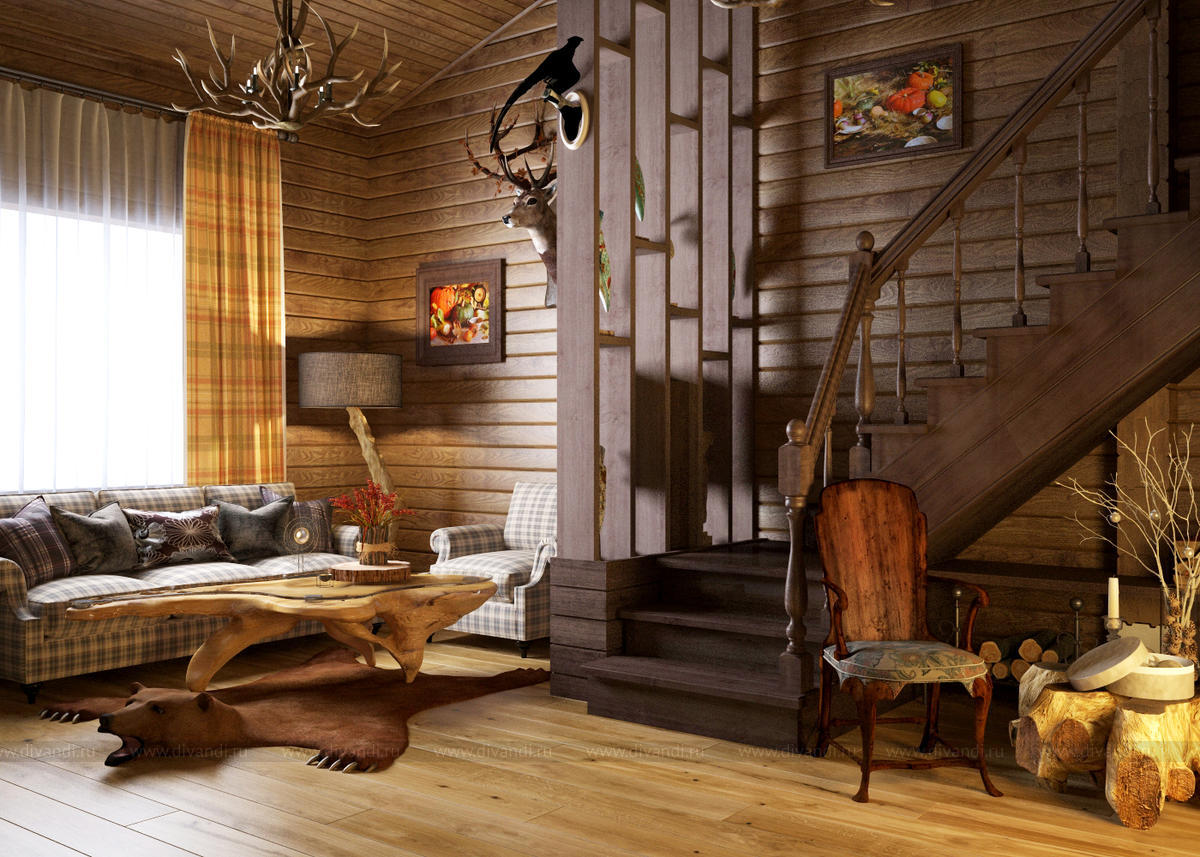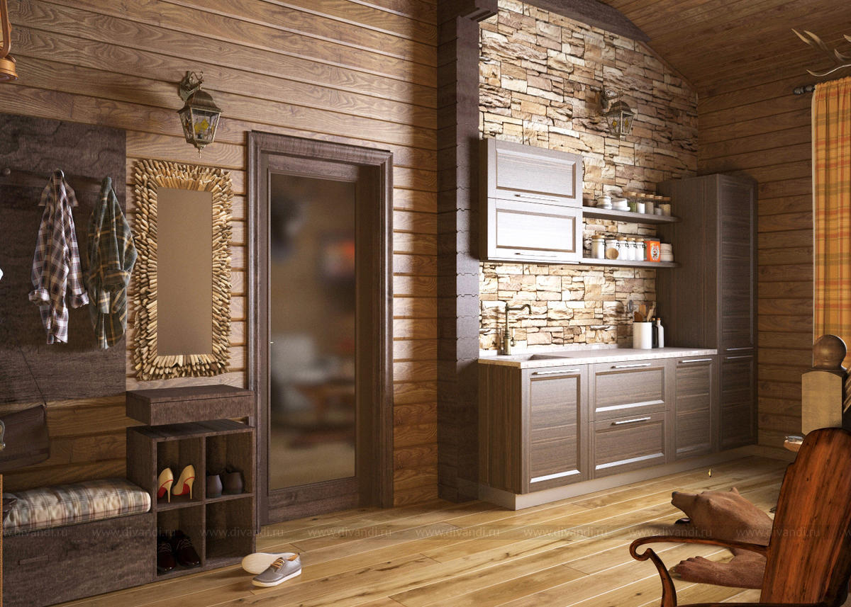 Это комната отдыха при банном комплексе для любителя охоты и путешествий.Дом из клееного бруса, в отделке применен декоративный камень.
