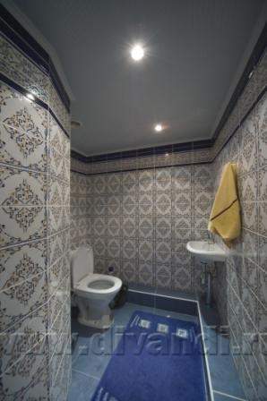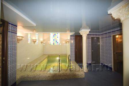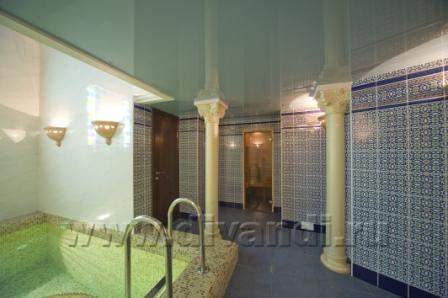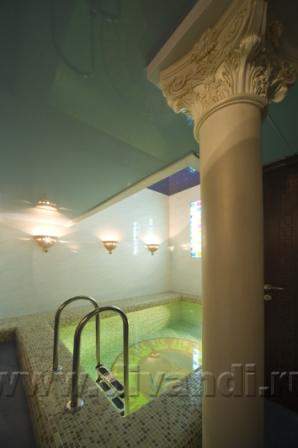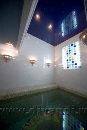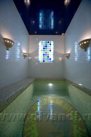 Помещение бассейна решено в бело – голубых тонах. Белая плитка с этническими орнаментами помогает скрыть некоторую «угловатость» стен. Над самим бассейном, облицованным бежево – золотистой мозаикой появился кусочек «звездного неба», в этом месте потолок выше, там почти 4 метра