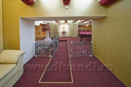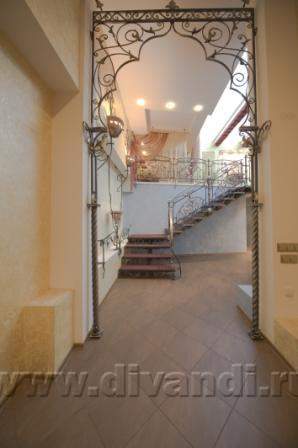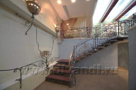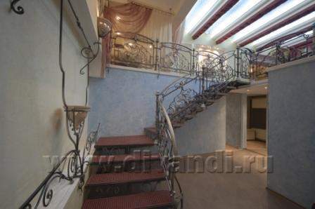 На второй этаж ведет изящная, словно парящая в воздухе кованая лестница. Ее ступени облицованы ковровым покрытием, которое применено также на всем втором этаже.
