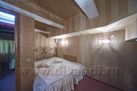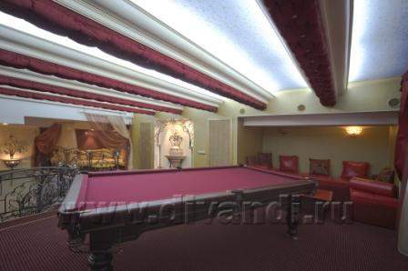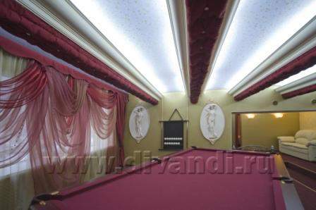 Высота второго этажа еще «скромнее», чем первого. Местами она даже меньше двух метров. Чтобы зрительно «приподнять» потолок второго этажа, на ребрах плит перекрытий укрепили лепные карнизы, за которыми разместили скрытую подсветку, а повышенную часть плиты оклеили обоями нежно – голубого цвета со звездочками. Интенсивная подсветка не позволяет глазу увидеть границу между вертикальной и горизонтальной частями плиты перекрытия и реально оценить высоко это или не очень.