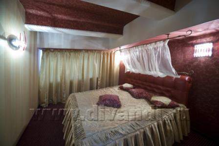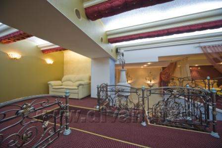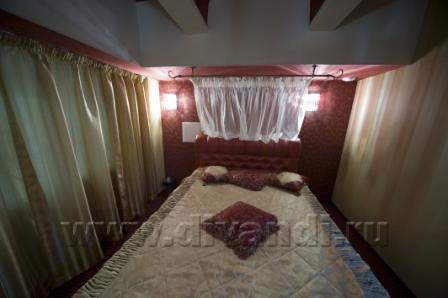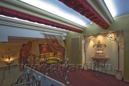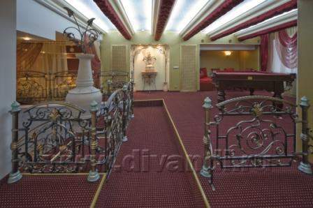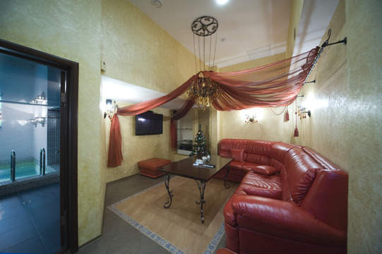 Зона отдыха выполнена совсем в другой цветовой гамме. Стены покрыты декоративной штукатуркой с насыщенным золотистым блеском. Сочетание оттенков бордового, красного и золотого, придает помещению богатый царственный вид.