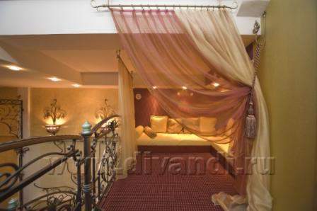 В интерьере очень много текстиля. Разноцветные, переливающиеся ткани разделяют помещение на отдельные уютные зоны. Именно при помощи изысканных занавесей из общей площади выделена кальянная. Мягкие диваны, разноцветные подушки, приглушенный свет.