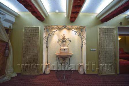 Темой интерьера стали воспоминания о восточных странах. Яркий запоминающийся колорит придал помещению некую «сказочность».