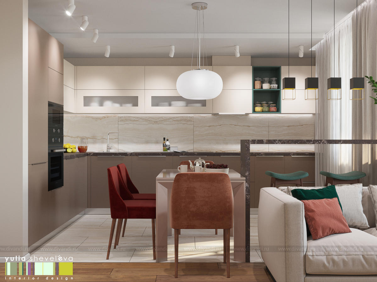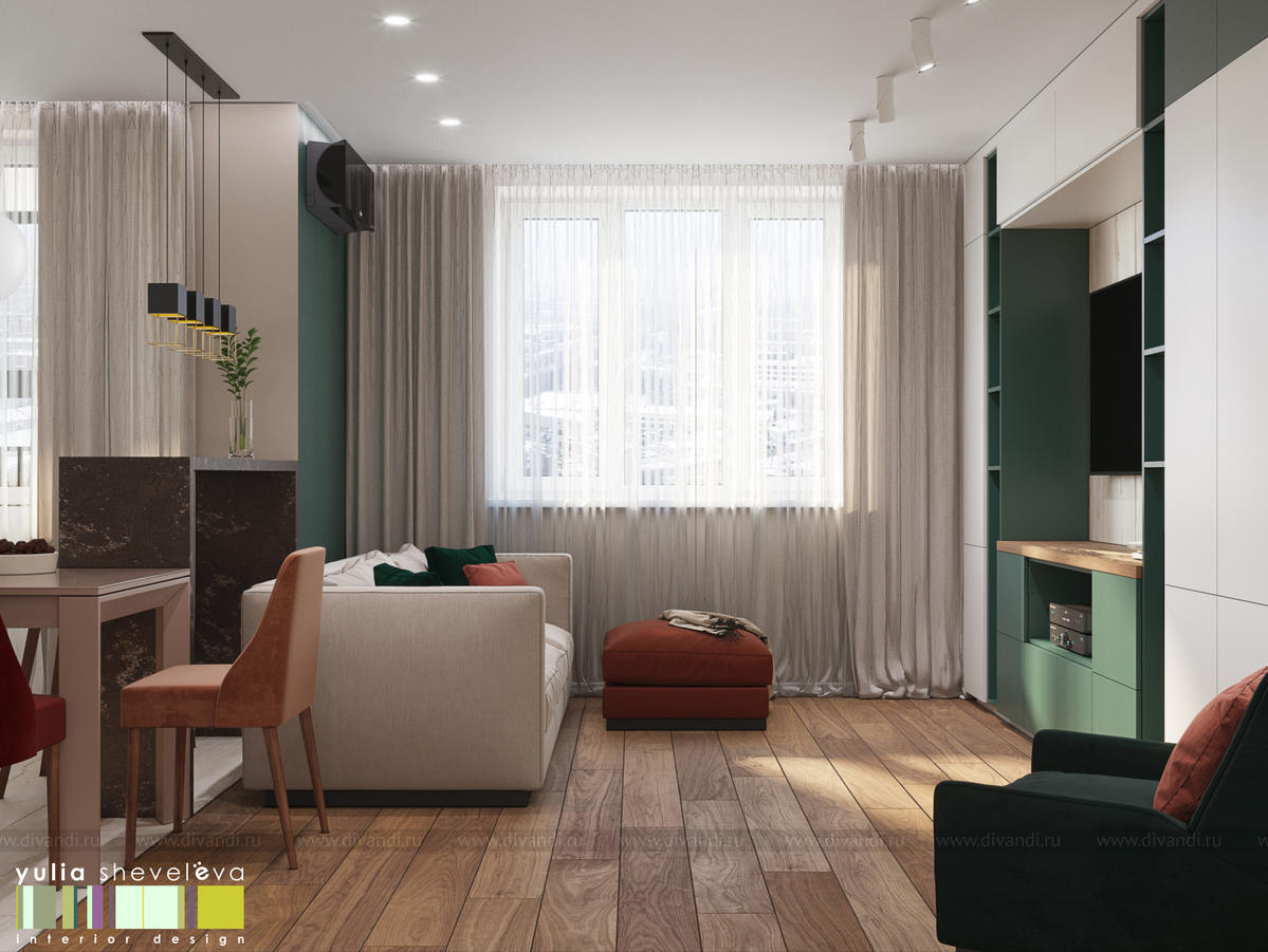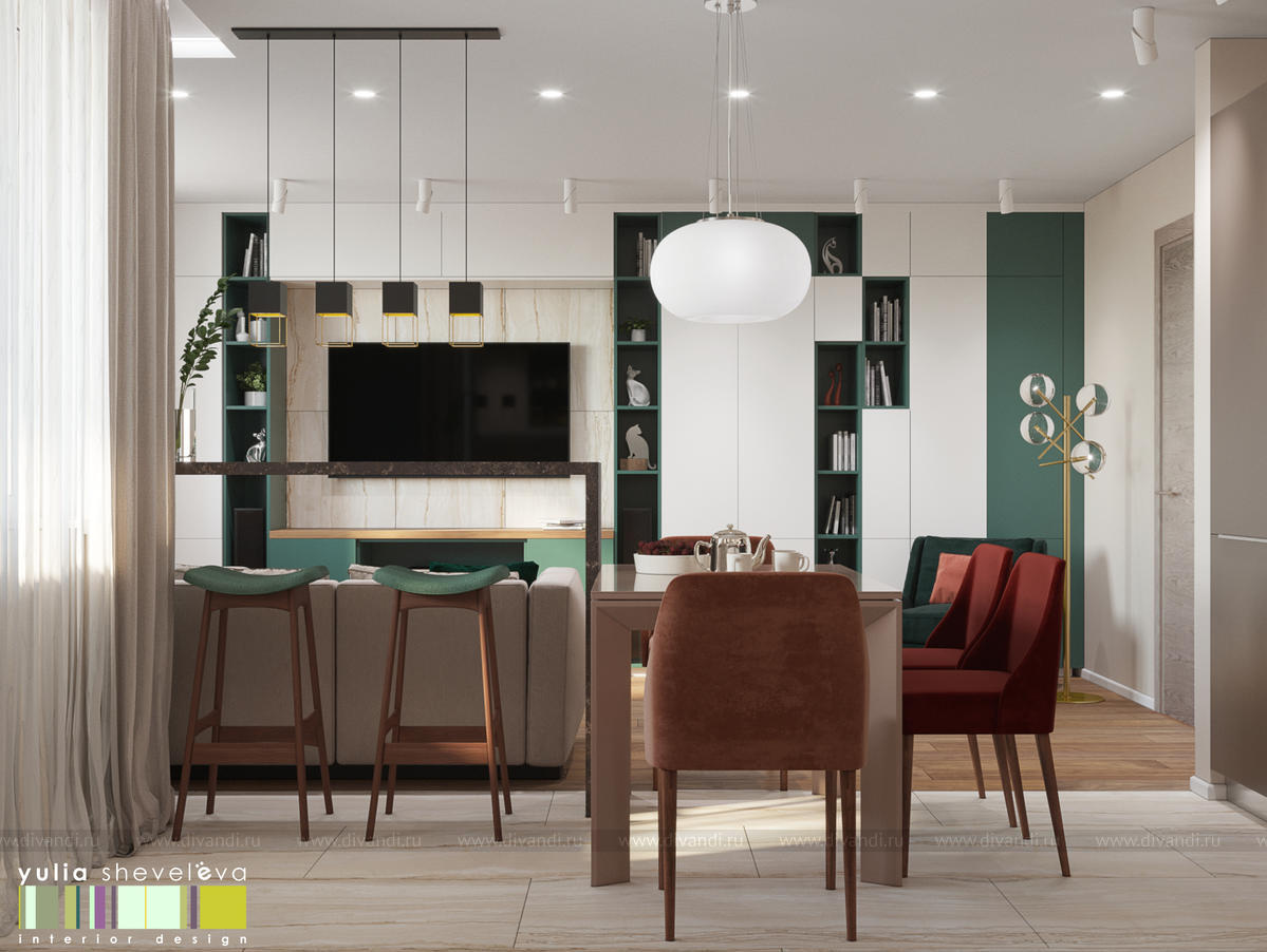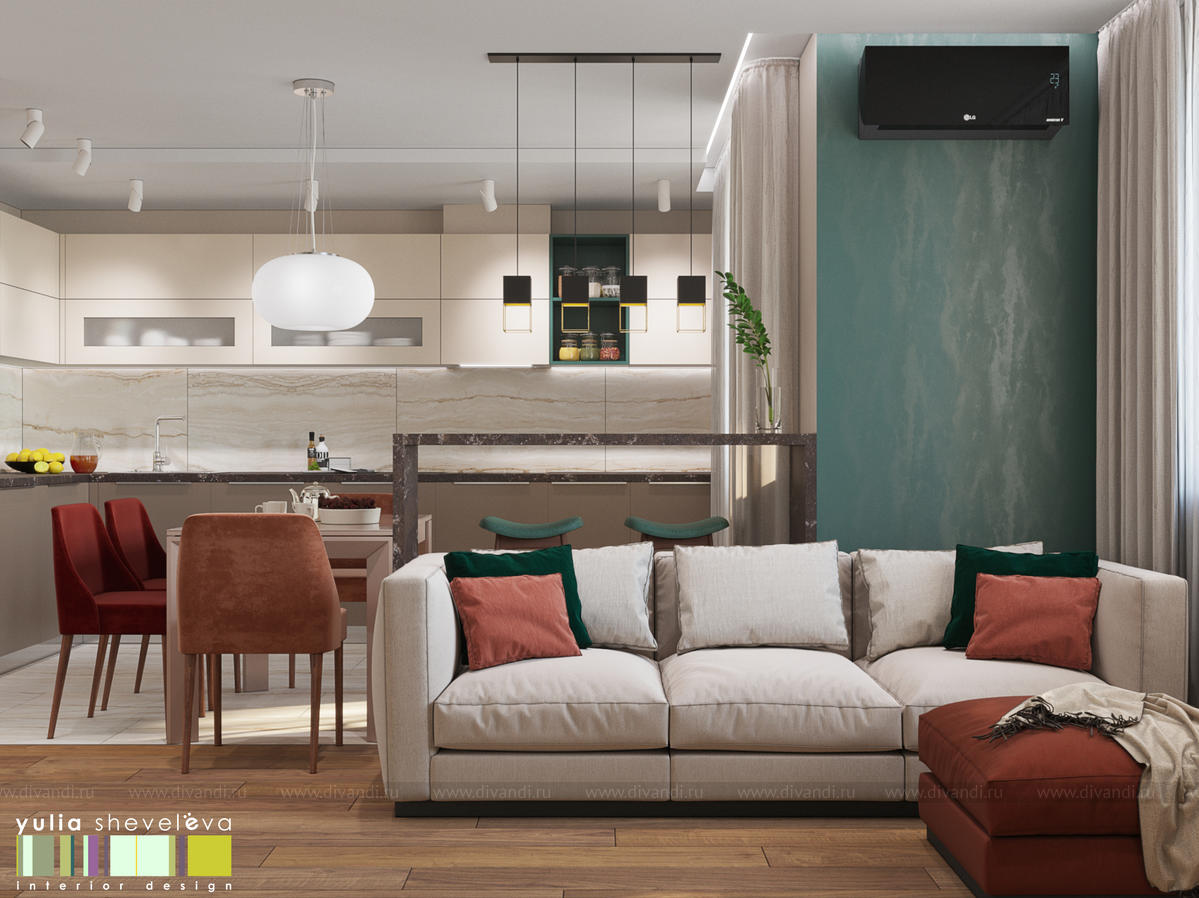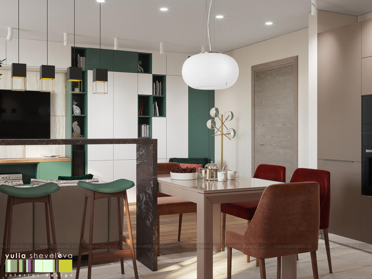 В гостиной, объединённой с кухней, основа интерьера - в комбинации сложных цветов, актуальной палитры этого года - винного, изумрудного и терракотового.