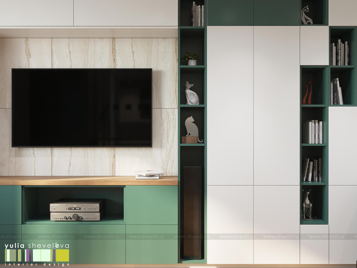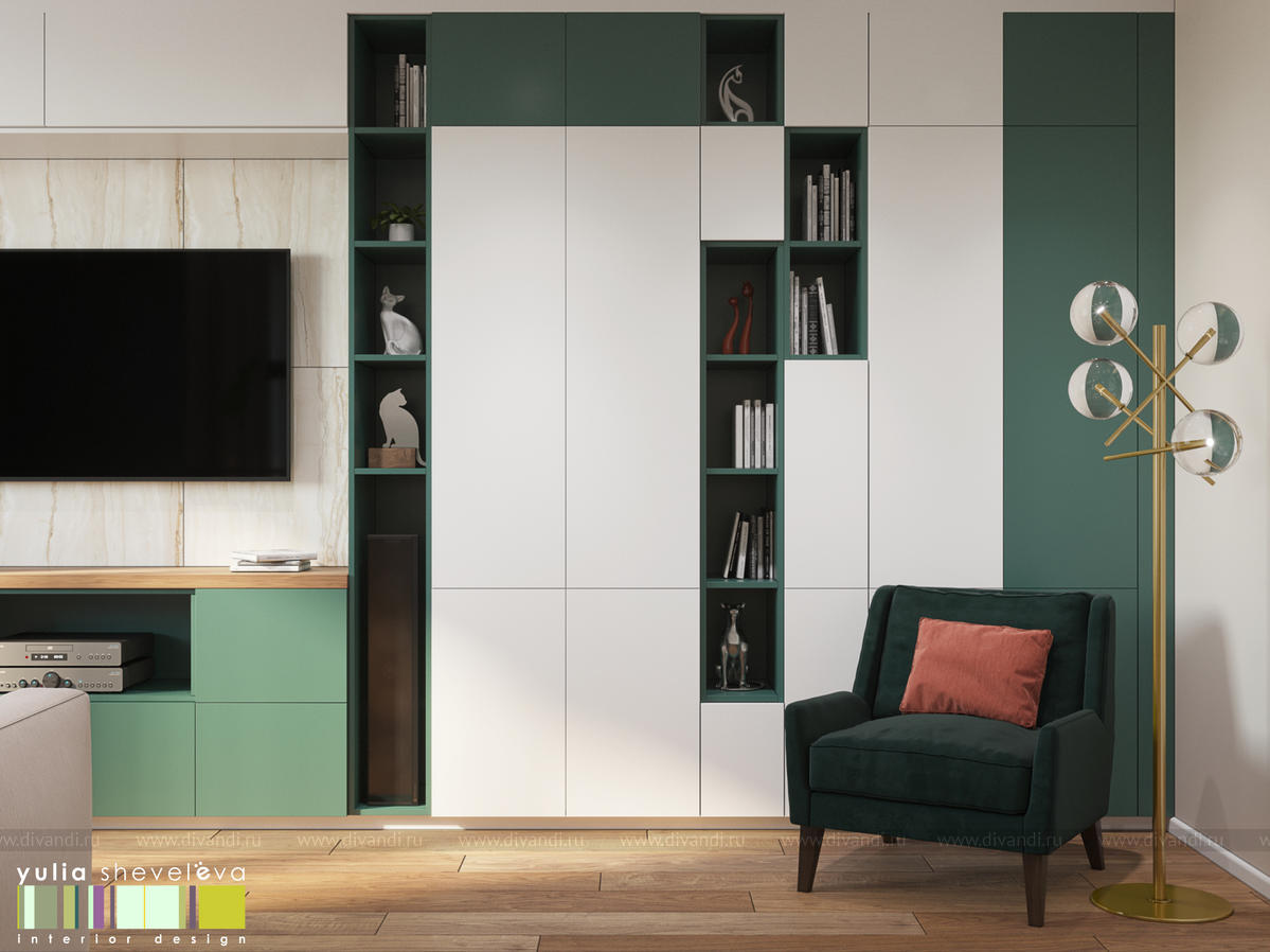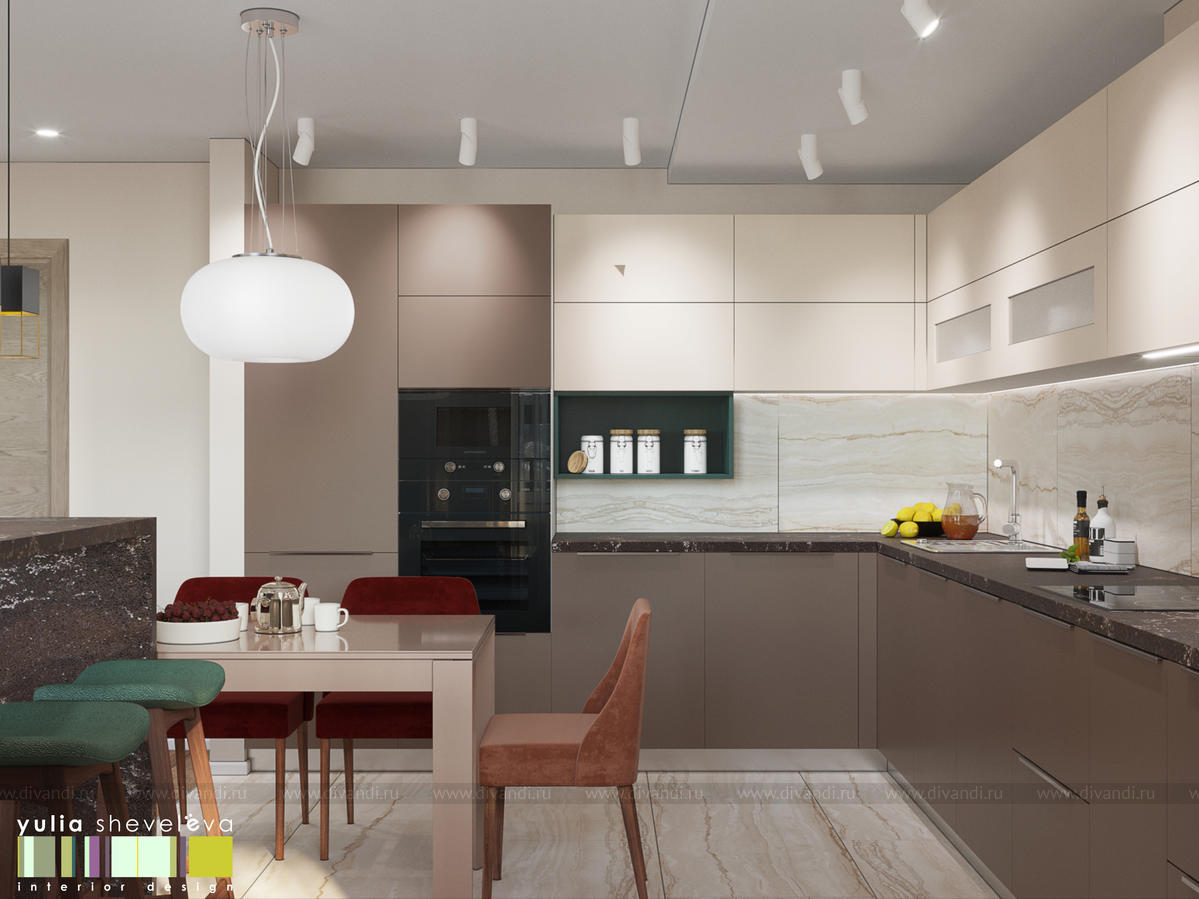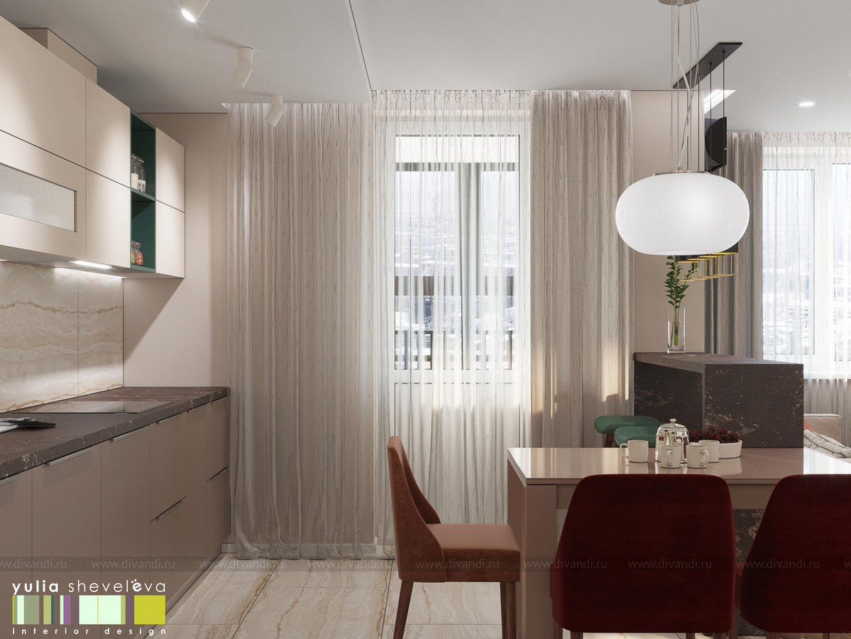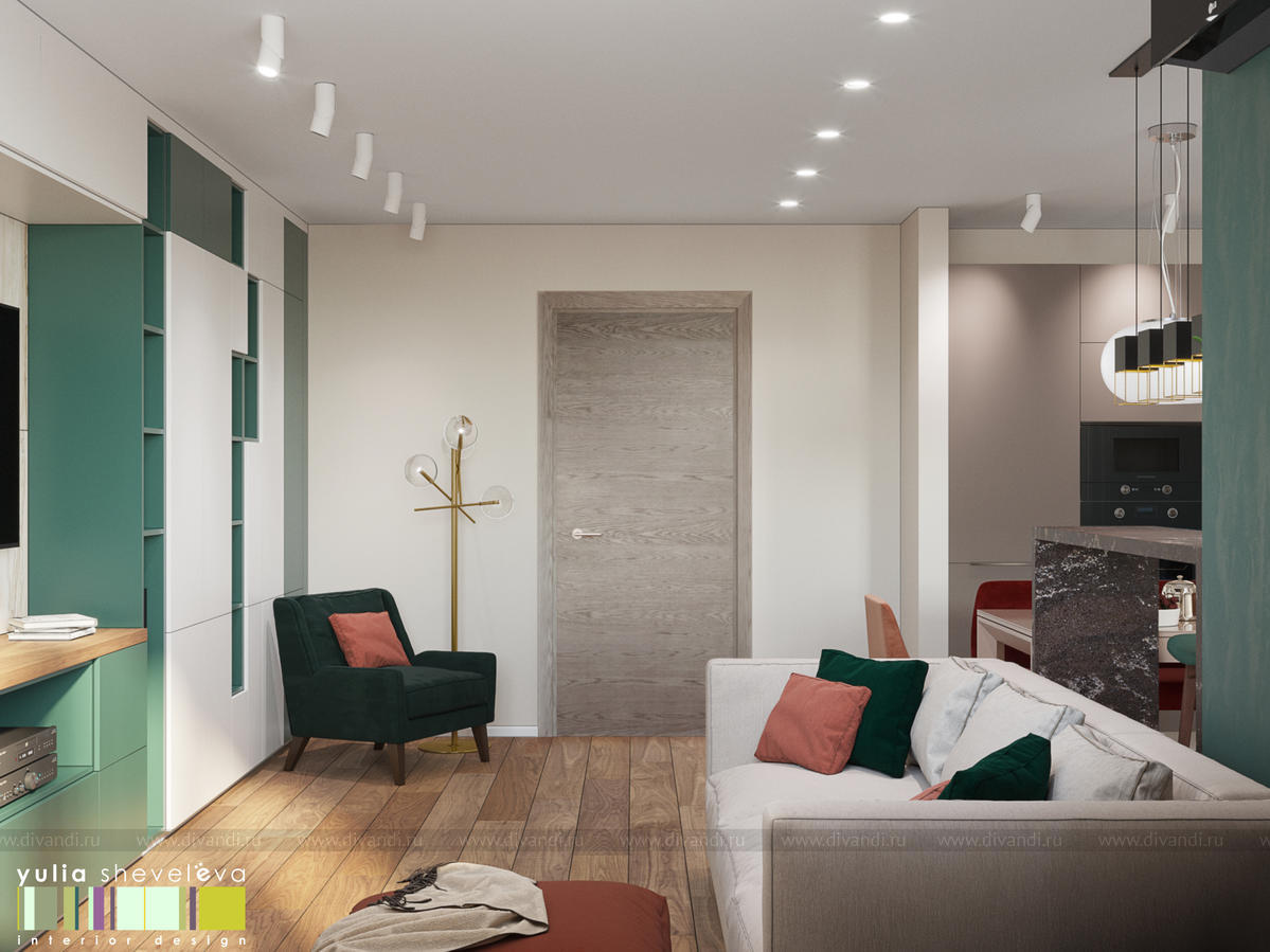 В гостиной, объединённой с кухней, основа интерьера - в комбинации сложных цветов, актуальной палитры этого года - винного, изумрудного и терракотового.