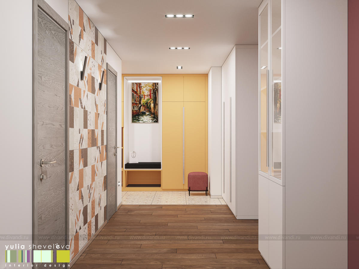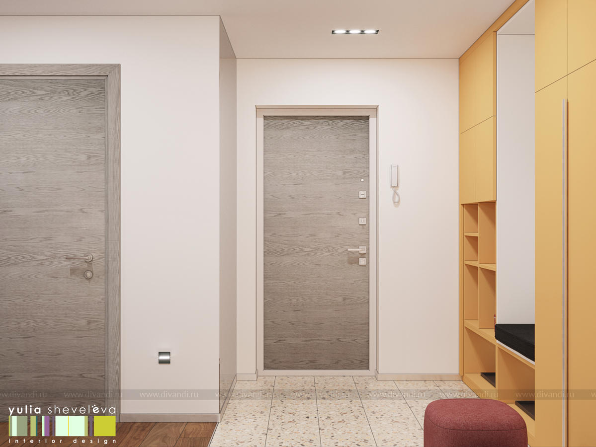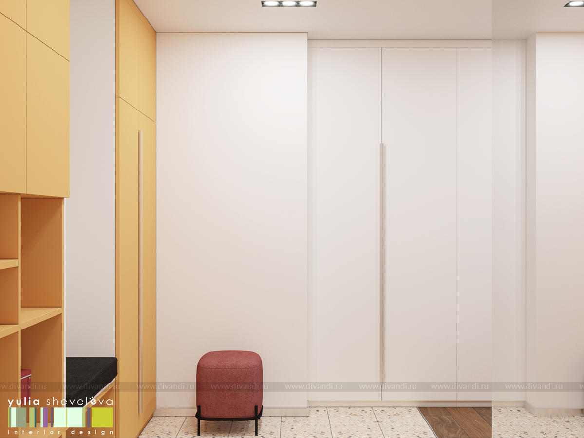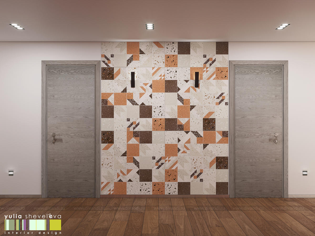 В холле на полу появилась плитка terrazzo, а также в виде панно на стене между ванными комнатами. Фасады шкафов, цвета «манго», соседствуют с винным оттенком стены, вся эта палитра перекликается с оттенками на плитке.