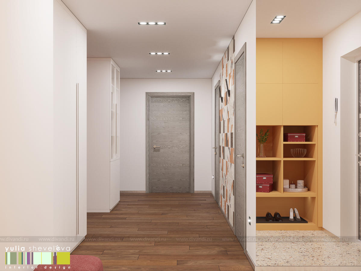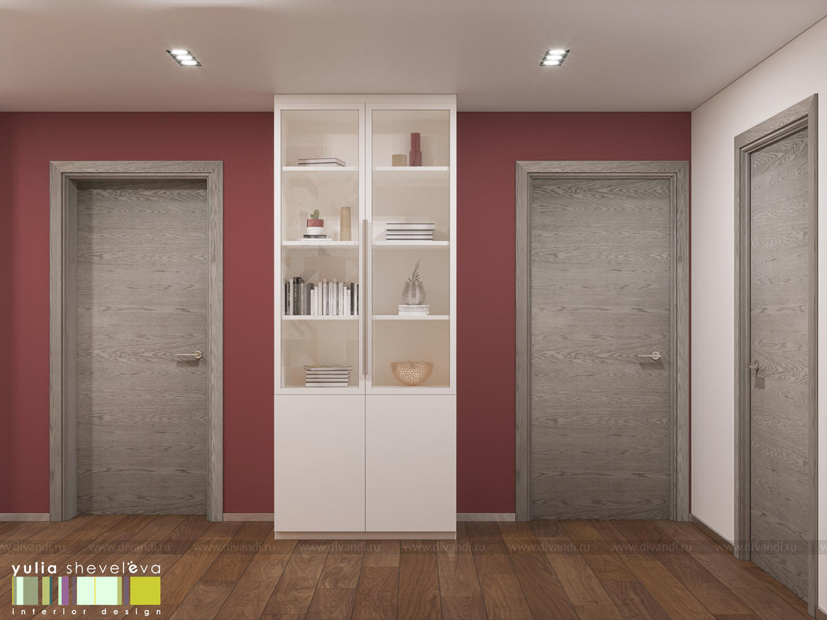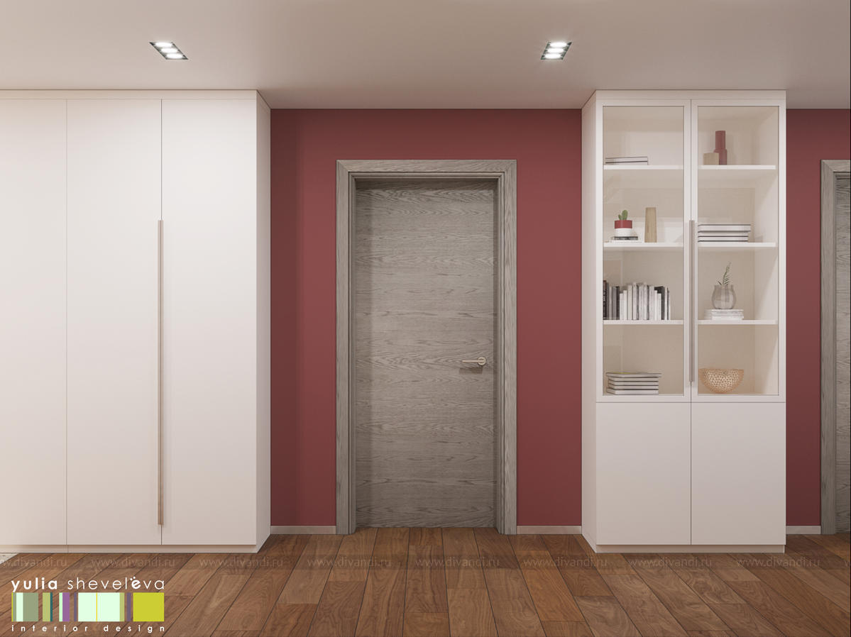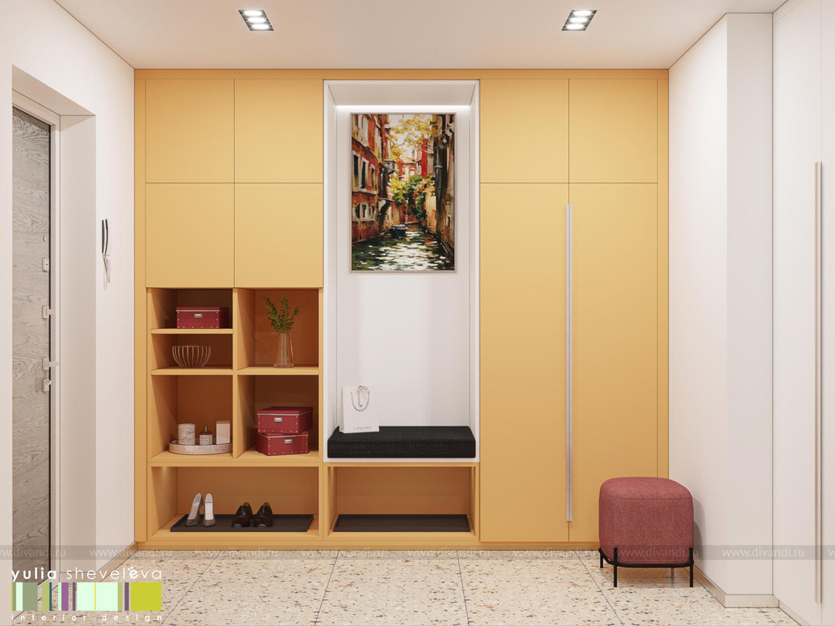 В холле на полу появилась плитка terrazzo, а также в виде панно на стене между ванными комнатами. Фасады шкафов, цвета «манго», соседствуют с винным оттенком стены, вся эта палитра перекликается с оттенками на плитке.