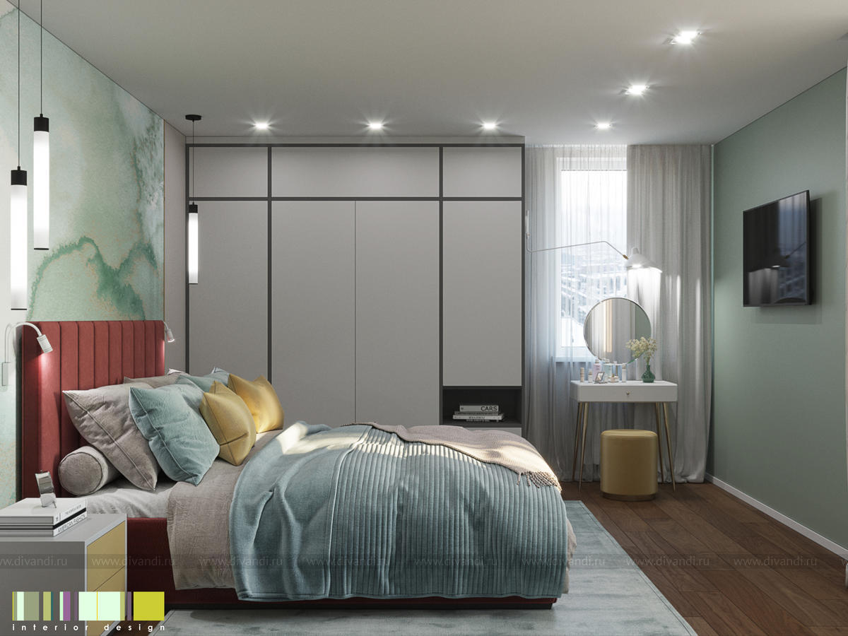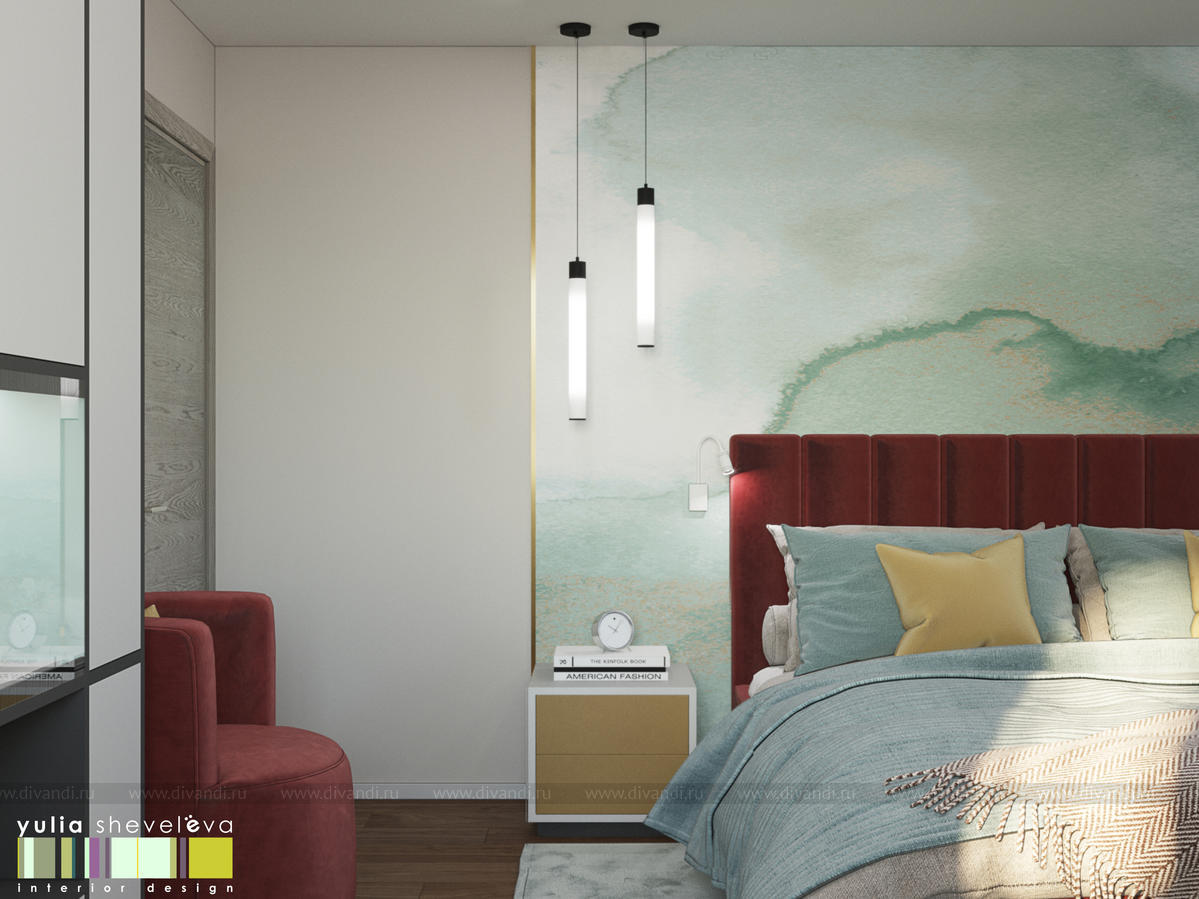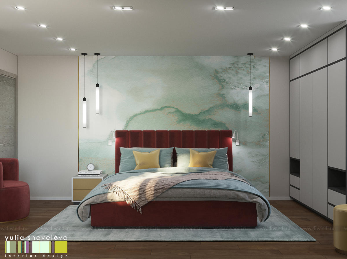 Спальная комната выдержана в этой же палитре, акцент выполнен на стене за изголовьем кровати в виде панно с перетекающими красками. Это панно будет выполнено на заказ художником.