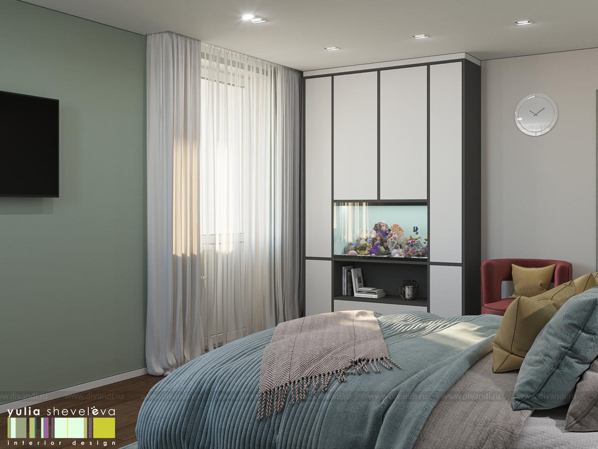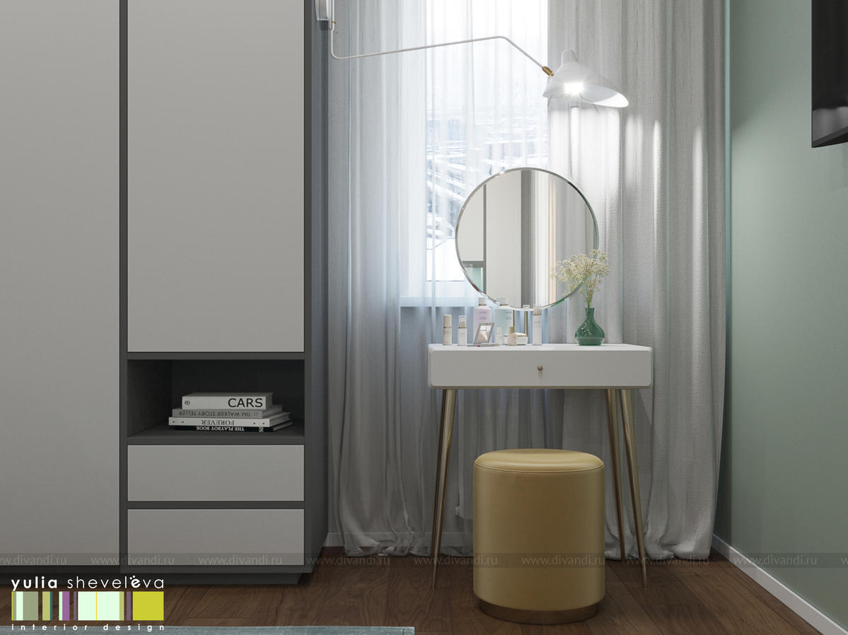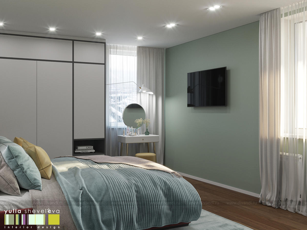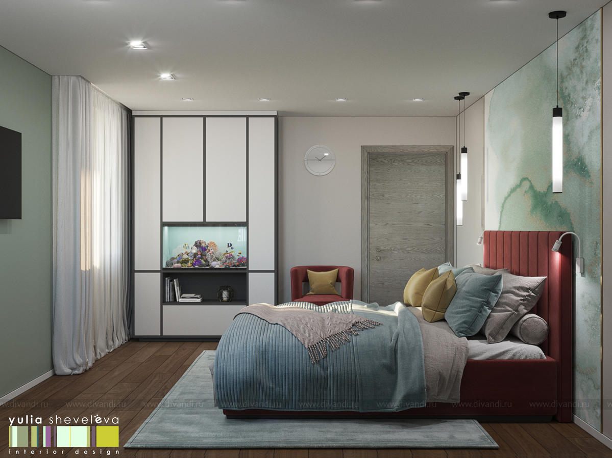 Спальная комната выдержана в этой же палитре, акцент выполнен на стене за изголовьем кровати в виде панно с перетекающими красками. Это панно будет выполнено на заказ художником.