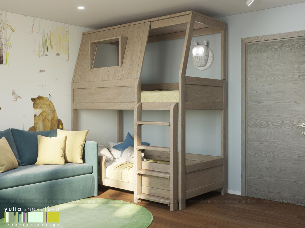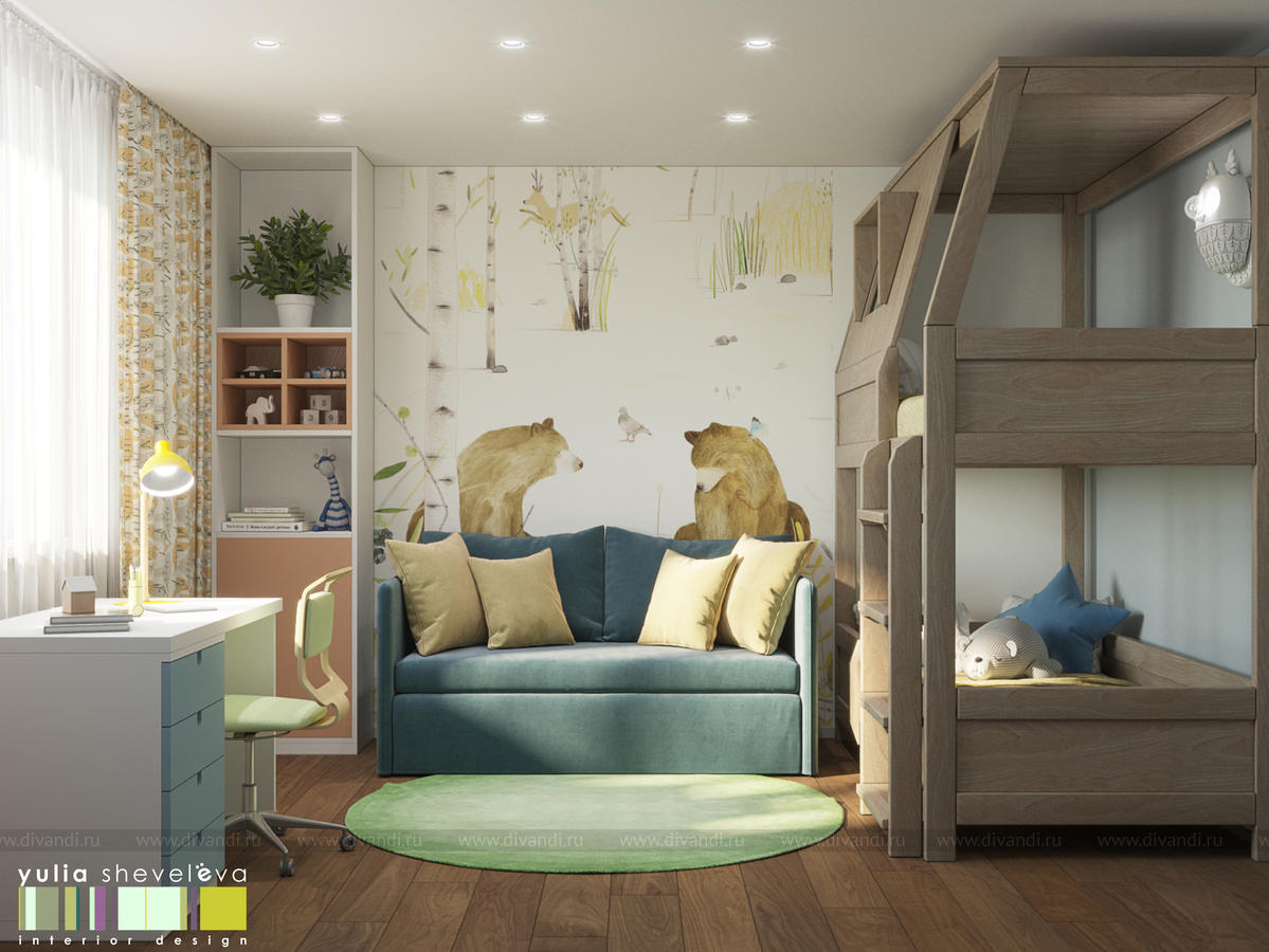 Детская для 1,5 годовалого малыша сделана в тематике волшебного леса. Сон будут охранять два бурых медведя, а спать и играть ребёнок будет в сказочном домике.