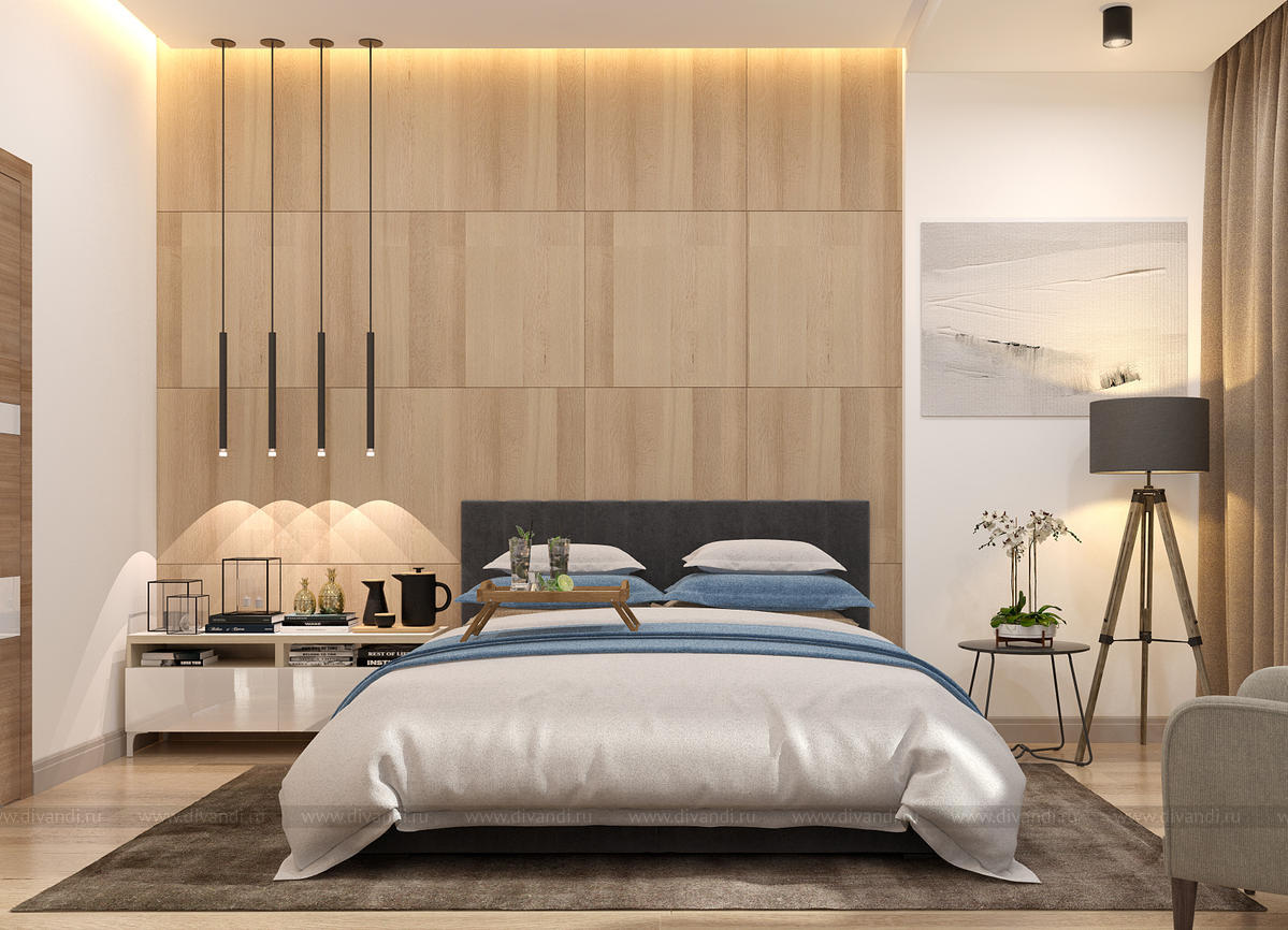 Цветовое решение проекта построено на спокойных пастельных тонах. Преобладают кофейные, припыленные оттенки, что создает домашний уют, а также комфортную обстановку. В отделочных материалах используются шпонированные мдф панели, деревянные окрашенные рейки и декоративный кирпич.