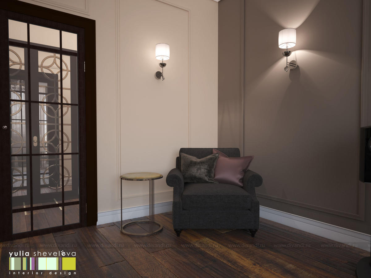 Главный козырь этого пространства - это высокие потолки, благодаря этому появилась возможность выполнить декорирование стен и потолка лепными элементами. Вдохновением для создания этого пространства послужили старые парижские квартиры, легкую атмосферу которых хотелось передать в этом интерьере. Обстановка и декор квартиры подобраны по принципу контраста - современных вещей и традиционных решений. Доминантой стали приглушённые тона - модные цвета сезона винный и оливково-болотный, особо любимые французами. Несмотря на насыщенность выбранных оттенков, интерьер смотрится очень изысканно и утончённо. Особый шарм интерьеру добавляет камин, портал которого облицован мрамором.