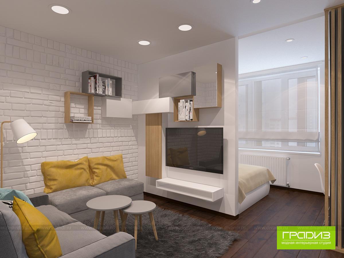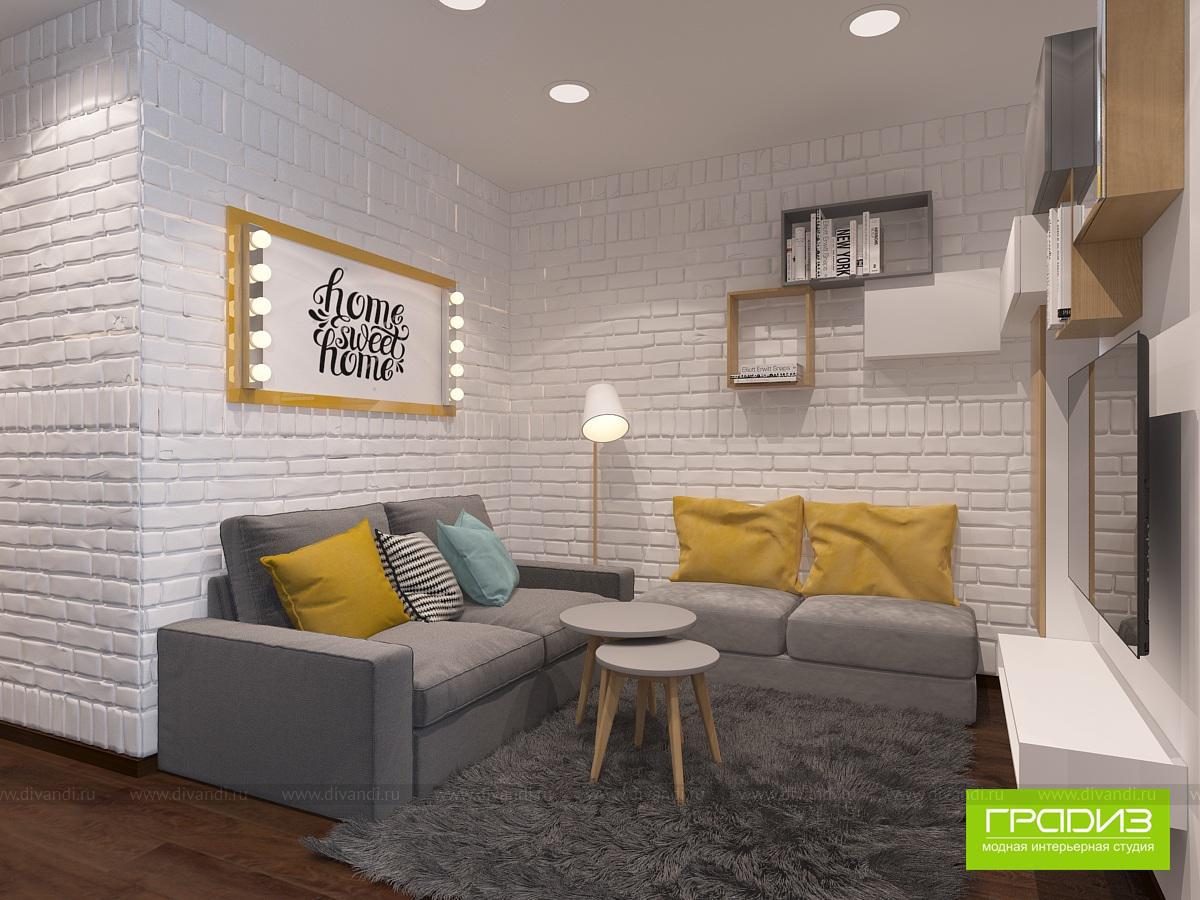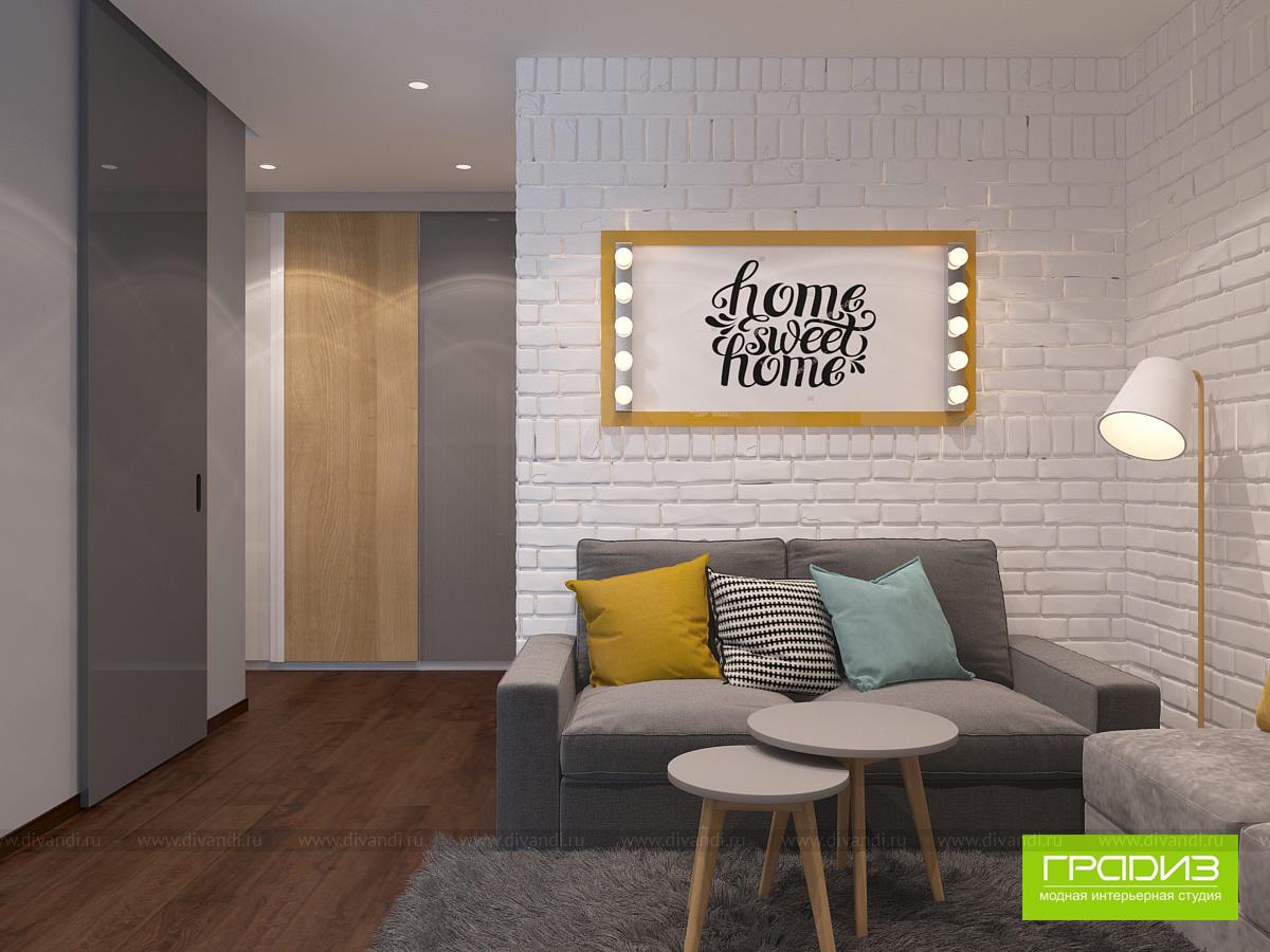 В этой однокомнатной квартире в ЖК "Мечта" будет жить пара студентов, которым родители купили квартиру. В интерьере нет каких-то очень дорогих решений, дизайн построен на интересном сочетании материалов и цветов. Чтобы выделить зоны, используются акценты в виде оригинального декора, ярких стен и потолка, необычных светильников.