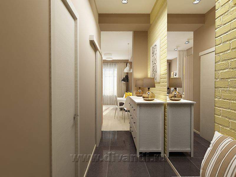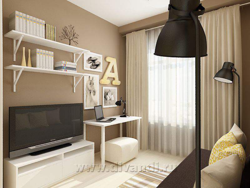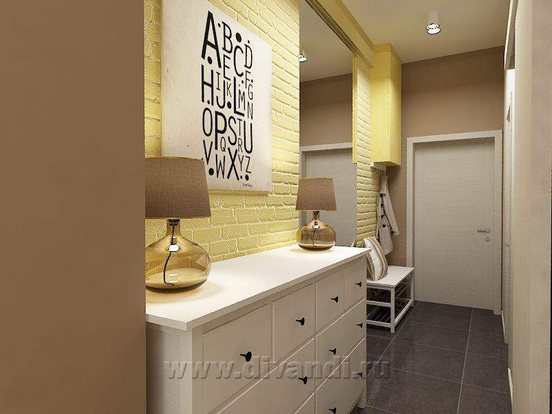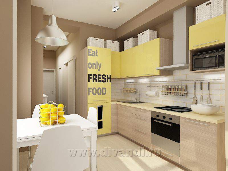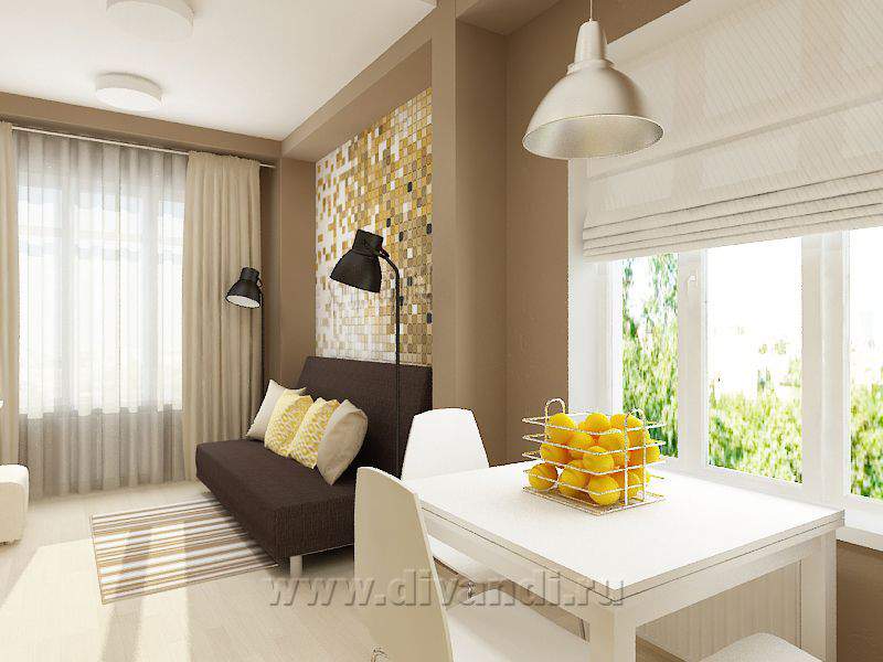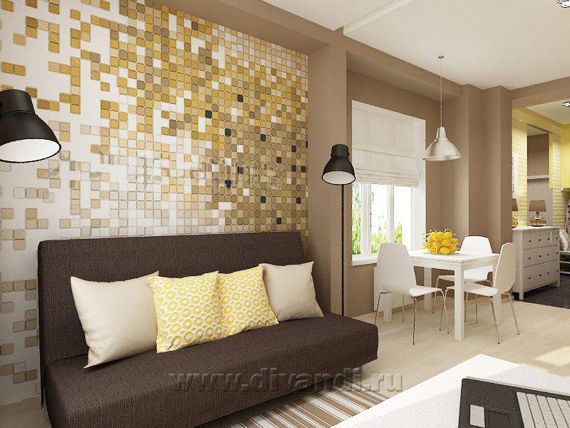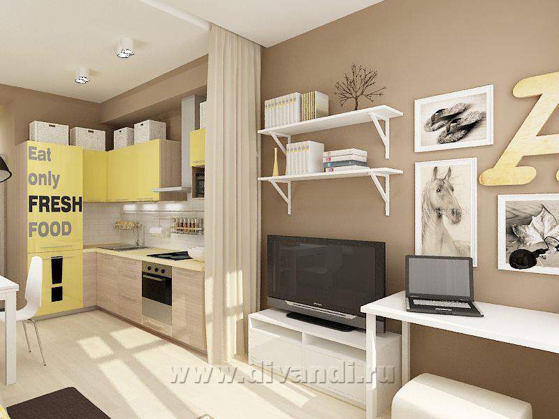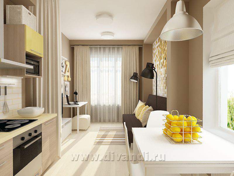 Поскольку это квартира-студия, главным пожеланием Заказчиков было разделить комнату и кухню. Для этого мы использовали штору – она не занимает много места, а в нужный момент легко разделяет пространство. Основные цвета, которые присутствуют в интерьере, - это разные оттенки бежевого и коричневого. Желтый цвет добавляет квартире солнца и делает пространство более уютным, а белый цвет, который был использован, в основном, в мебели, добавляет проекту легкости и свежести.