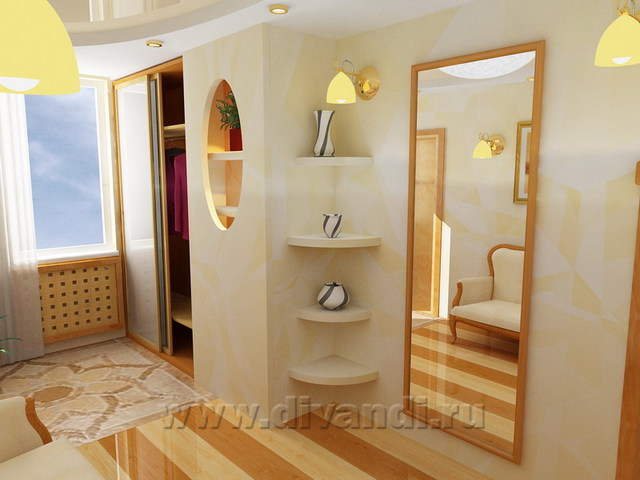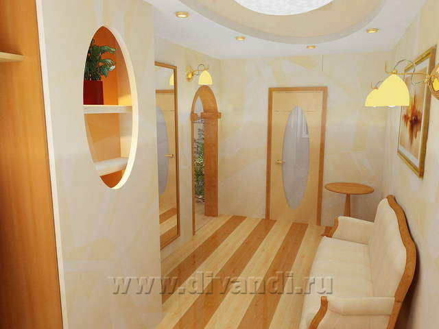 Холл-прихожая сама по себе довольно просторная и светлая. Плавные формы потолка и декоративных ниш обеспечивают парадность помещению, а чередование цвета паркетного пола задают динамику движения по направлению к гостиной.