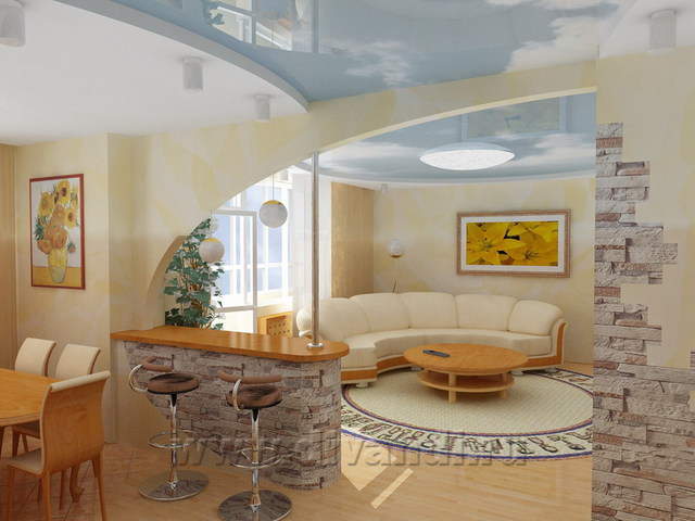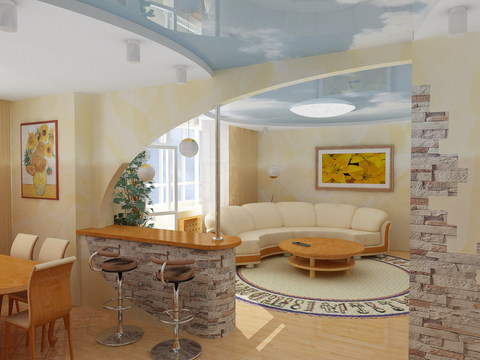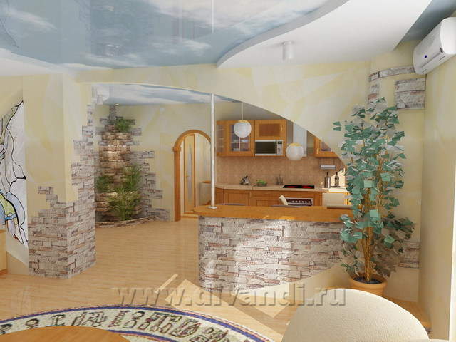 Чтобы придать больше объема кухне-гостиной и визуально "приподнять" потолок, мы применили натяжной потолок с фотопечатью. Теперь хозяева будут иметь "свой" кусочек неба. А фонтан с циркулирующей водой и живыми растениями будет дополнять ощущение открытости помещения.