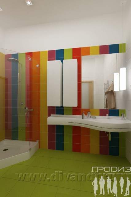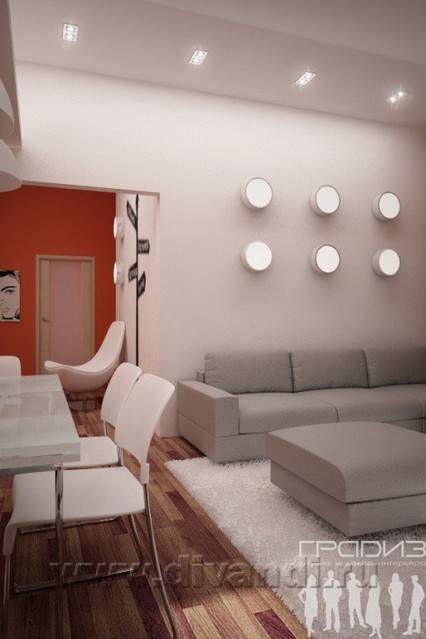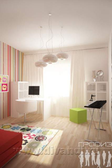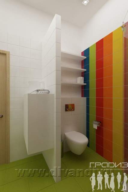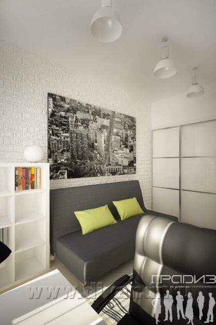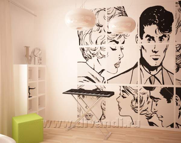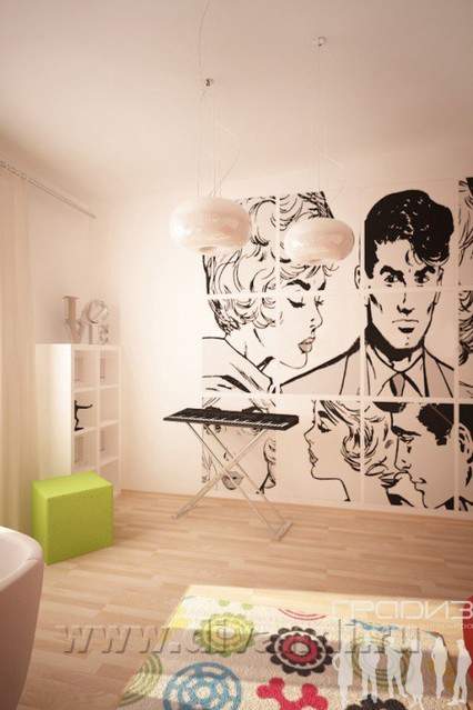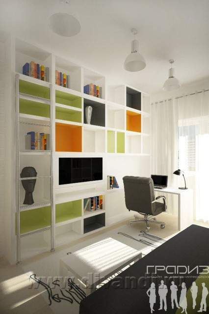 Стиль всей квартиры задала сама квартира. Все помещения получились светлыми, что еще больше добавило воздуха и простора. Основным цветом является белый с добавлением ярких акцентов: в детской это яркие обои в стиле поп-арт и диван, в кабинете – стеллаж с разноцветными полками, которые разбавляют официальную атмосферу.