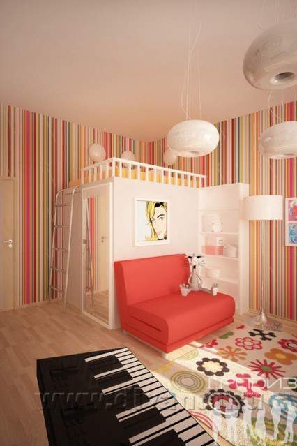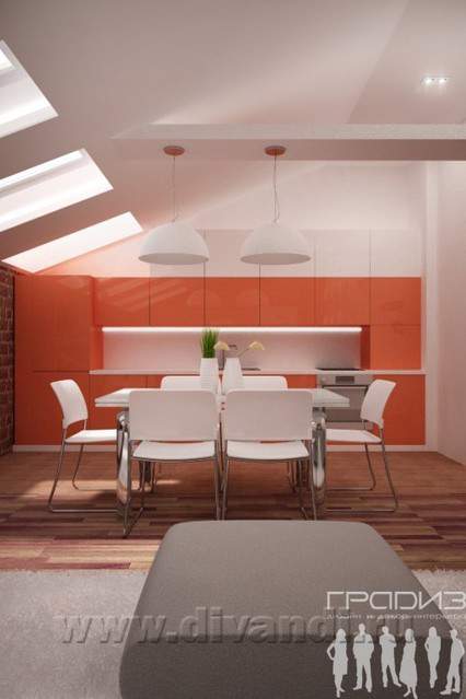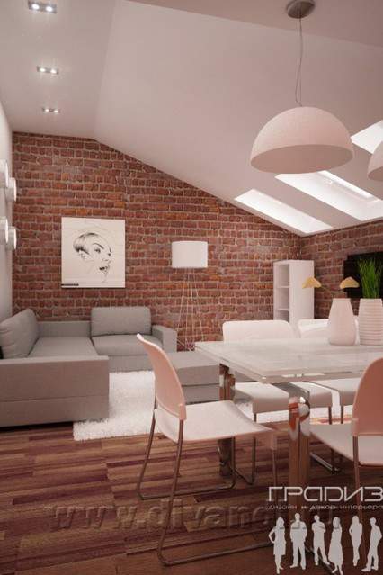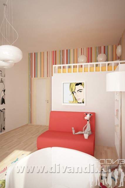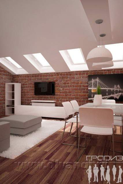 Не часто выдается возможность поработать с квартирой, расположенной на мансардном этаже. Особенность данных квартир заключается в том, что потолки идут под наклоном, и их максимальная высота достигает 4 метров, что позволяет дизайнеру расположить мебель и оборудование в несколько ярусов, тем самым зрительно увеличить пространство и «вдохнуть» больше воздуха в помещение. Именно так мы и сделали в детской, расположив «ложе принцессы» выше уровня глаз, под ним находится вместительная гардеробная. В гостиной мы столкнулись с тем, что в зимний период мансардные окна засыпает снегом и поступление солнечного света ограничивается. Но мы решили эту проблему за счет мощных встроенных светильников.