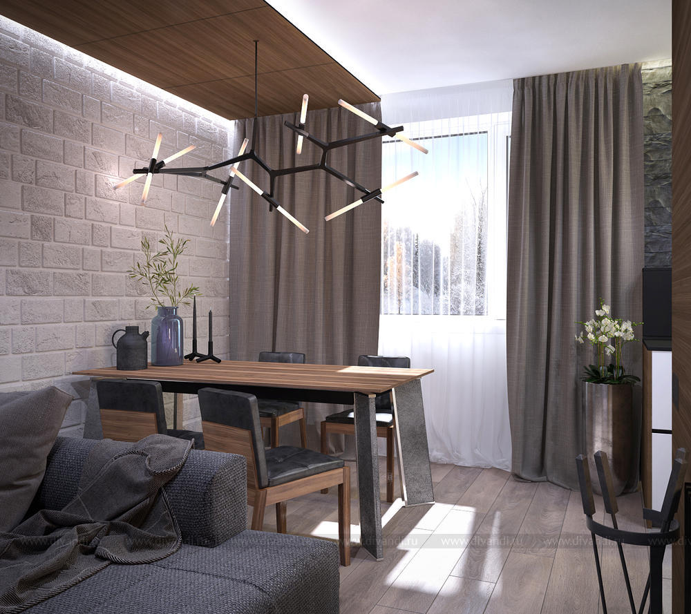 Квартира выполнена в современной стилистике в отделке натуральными материалами и с элементами природной среды.