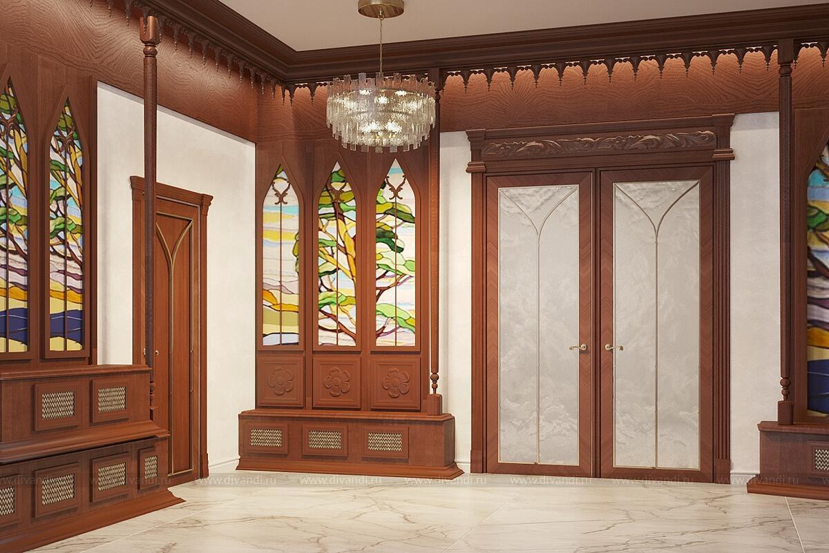 витражные вставки в деревянных рамах добавляют яркости и изысканности.