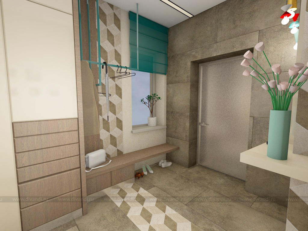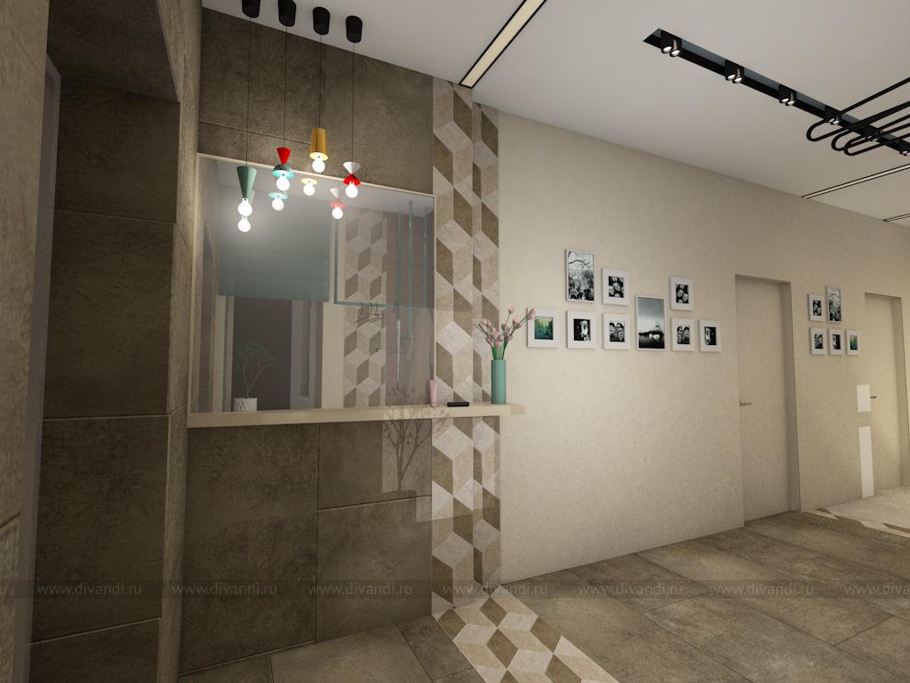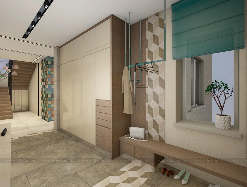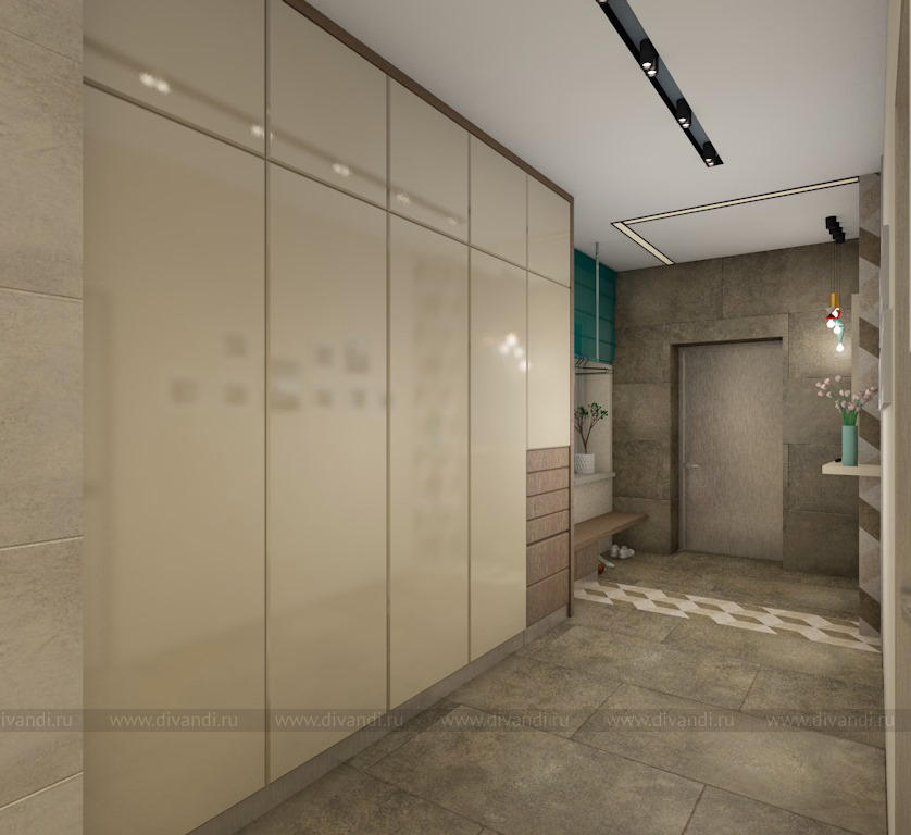 Яркие цветовые акценты сложного зелено-синего оттенка выделяются нв фоне спокойной гаммы шкафов и керамогранита.